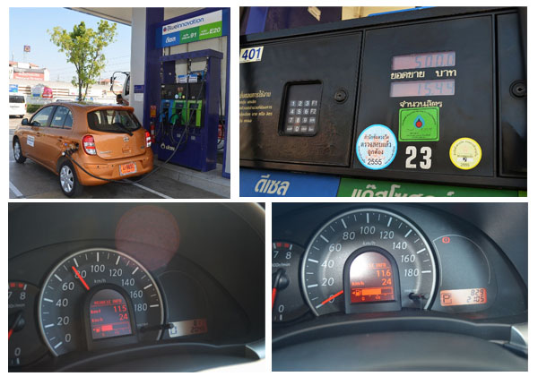 ก่อนเติมน้ำมันE20 หลังเติม 500 บาท/15.44 ลิตร หลังทดสอบเสร็จ นิสสัน มาร์ช มีอัตราสิ้นเปลื่องน้ำมันตามที่โฆษณาไว้คือ 20 กม./ชม. ซึ่งในความเป็นจริงใช้งานในเมืองเป็นหลัก หรือนอกเมืองที่วิ่งระยะสั้นๆ นั้น คงเป็นไปได้ยาก ประกอบกับรถที่ติดตามแยกต่างๆ ดังนั้นการทดสอบครั้งเป็นการขับผ่านเส้นทางทั้งรถเยอะ รถน้อย ติดน้อย ติดนาน ในและนอกเมือง ทำให้ได้อัตราการสิ้นเปลืองใกล้เคียงใช้งานแบบไลฟ์สไตล์จริงๆ และผู้ขับทดสอบใจยังวัยรุ่น เท้าหนักบ้างถ้าโอกาสเหมาะ ทำให้ตัวเลขใช้งานจริงบนหน้าปัดวัดได้ 11.5-11.7 กม./ลิตร แต่ว่าเมื่อรวมระยะทางทดสอบพร้อมกับการจราจรคับคั่งตลอดเส้นทางนั้น ระดับน้ำมันบนหน้าปัดแทบไม่ลดระดับลงเลย เกือบเท่าตอนที่เติมใหม่ๆ จากการทดสอบในครั้งนี้อาจไม่มีตัวเลขมายืนยันอัตราสิ้นเปลืองได้ แต่ก็พิสูจน์จากใช้งานจริงในเมืองและชานเมืองประหยัดเห็นๆ หรือดูระดับน้ำมันว่าลดไปเท่าไร