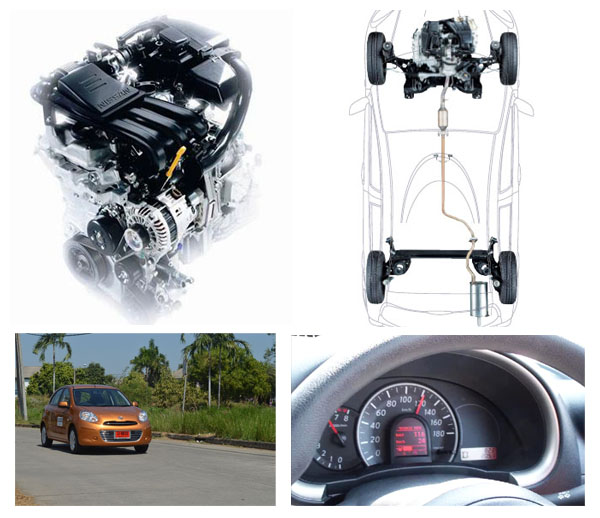 นิสสัน มาร์ช มีจุดเด่นที่ขนาดตัวรถเล็ก แต่ภายในกว้างเหลือเชื่อตามแบบฉบับของนิสสันที่เน้นกว้างนั่งสบาย มิติตัวถังยาว 3,780-3,800 มม. กว้าง 1,665 มม. สูง 1,515 มม. ระยะฐานล้อ 2,450 มม. ทำไม่ต้องบอกขนาดรถ? ก็เอาไว้เทียบกับรุ่นอื่นเพื่อประกอบการตัดสินใจครับ รวมๆ แล้วรูปร่างน่ารัก น่าหลงใหล ไฟหน้ามัลติรีเฟลตเตอร์ขนาดใหญ่สว่างทั่วถึงแม้ขับทางไกล กระจังหน้าและช่องดักลมโครเมียม มือจับประตูคู่หน้าและกระโปรงท้ายแบบกดปุ่มเปิดล็อคไม่มีรูกุญแจ ด้านหลังติดตั้งสปอยเลอร์ ไฟเบรกดวงที่ 3 และใบปัดน้ำฝน เซ็นเซอร์ถอยหลัง 4 จุด กระจกข้างพับไฟฟ้าเมื่อล็อคประตู ระบบกุญแจ Intelligent Key พร้อม Immobilizer ล้อแม็กลาย 7 ก้าน 15 นิ้ว ยางดันลอปขนาด 175/60 และช่วงล่างที่ใว้ใจได้ในรถระดับนี้ ภายในเด่นด้วยปุ่มกดสตาร์ต-ดับเครื่องยนต์ แอร์อัตโนมัติ จอแสดงผลอัตราสิ้นเปลือง เบาะหลังพับได้ 60:40 เครื่องเสียงพร้อมช่องเชื่อมต่อ AUX-IN ถุงลมคู่หน้า เครื่องยนต์ 3 สูบ เดินนิ่งที่แสนประหยัด พร้อมเกียร์ CVT เปลี่ยนนุ่มและต่อเนื่อง