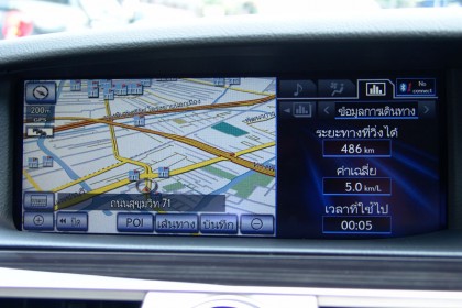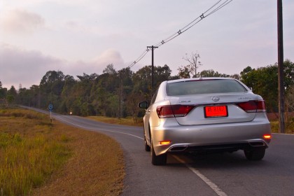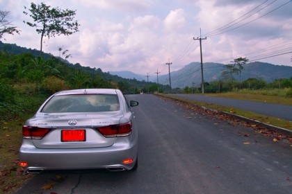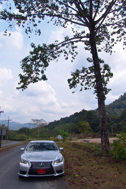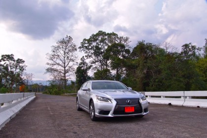 ผมขับทดสอบทางไกลแบบขับยาวๆ ใช้เส้นทางรังสิต-องค์รักษ์ มุ่งหน้าไปยัง จ.นครนายก เจ้า LS 460L ราคาเกือบๆ 12 ล้านดูขัดแย้งกับเส้นทางเลี่ยงเมืองที่มุ่งหน้าไปยังน้ำตกสาริกาและวังตะไคร้ ถนนเลี่ยงเมืองยาวสิบกว่ากิโลเมตรมีความเรียบโล่งไร้รถราขวักไขว่แม้จะเป็นวันหยุดสุดสัปดาห์ ผมขับขึ้นไปบนถนนเล็กๆ ที่วกวนของเขื่อนขุนด่านปราการชล จอดถ่ายภาพแล้วขับไปยังด่านเนินหอมในเขต จ.ปราจีนบุรี ซึ่งเป็นทางขึ้นสู่วนอุทยานแห่งชาติเขาใหญ่ ทางเขตจังหวัดปราจีนบุรี เส้นทางจากเขื่อนขุนด่านฯ ไปยังทางเข้าวนอุทยานแห่งชาติเขาใหญ่ยาวประมาณ 24 กิโลเมตร เป็นทางลาดยางสองเลนสวนกันที่ค่อนข้างสงบเงียบไม่จอแจเหมือนทางหลัก ระบบนำทางด้วยเมนูภาษาไทยของ Lexus LS 460L แจ้งเพียงแค่ทิศทางที่รถมุ่งหน้าไปโดยบอกแต่เพียงว่ารถกำลังวิ่งอยู่บนทางสุขาภิบาล มันให้รายละเอียดของแผนที่ค่อนข้างครอบคลุม รวมถึงความง่ายของการใช้งานจากเมนูภาษาไทยที่อ่านหรือปรับตั้งได้รวดเร็ว ถนนสุขาภิบาลจากตัวเขื่อนไปยังด่านเนินหอมนอกจากจะแคบแล้วยังลัดเลาะตัดผ่าเข้าไปยังหมู่บ้านเล็กๆ ที่เรียงรายสองข้างทาง จนทำให้ LS 460L ดูขัดแย้งกับภูมิประเทศในแถบนี้อย่างสิ้นเชิง ชาวบ้านร้านตลาดต่างพากันจ้องมองรถคันยาวที่วิ่งฝ่าฝุ่นจากทางลูกรังในบางช่วงจนตัวรถโดนฝุ่นเกาะแดงเถือกไปหมด