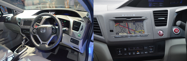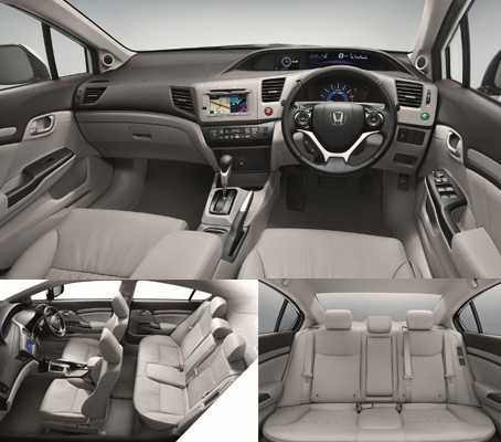 ซีวิค ไฮบริดใช้วัสดุหุ้มเบาะภายในแบบผ้าในรุ่น Hybrid และเบาะหนังแท้/วัสดุหนังสังเคราะห์ ในรุ่น Hybrid Navi ปุ่มกดสตาร์ต-สต็อป มาตรวัดเรืองแสงแบบ พวงมาลัยมัลติฟังก์ชั่นปรับ 4 ทิศทาง ระบบปรับอากาศอัตโนมัติ ช่องวางแก้วน้ำ 5 ตำแหน่ง