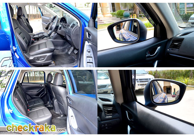 ทัศนวิสัย ส่วนฝากระโปรงหน้าที่มีช่วงไม่ยาวมาก ทำให้กะระยะเลี้ยวในทางแคบๆ ได้สบาย สำหรับตำแหน่งผู้ขับสามารถมองเห็นได้รอบตัวรถ แม้ส่วนกระจกด้านหลังจะดูแคบ แต่ก็ไม่เป็น ปัญหา การกะระยะ มุมมองของกระจกส่องหลังเห็นทั่วบริเวณกระจกด้านหลังและเห็นทางด้านซ้ายของตัวรถ ช่วยเพิ่มความแม่นยำในจังหวะเปลี่ยนเลน กระจกมองข้างทรงเหลี่ยมขนาดใหญ่มองเห็นได้ชัดเจนติดตั้งที่ประตู โดยออกแบบให้มีช่องระหว่างกระจกเพื่อให้มองเห็นลอดผ่านในมุมที่กำลังเลี้ยวโดยไม่ต้องชะโงกหน้ามอง มุมมองส่วนทางด้านหลังแม้ตัวรถจะถูกยกสูง แต่ระดับการมองเห็นแทบไม่ต่างกับรถปกติ มาสด้า CX-5 รุ่นนี้ขับง่าย สะดวกทุกมุมมองไม่แตกต่างจากรถเก๋ง