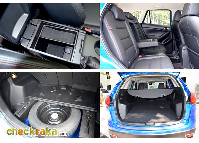 ส่วนของที่นั่งผู้โดยสารตอนหลังออกแบบให้ใช้งานได้หลายรูปแบบและเป็นครั้งแรกที่เบาะแยกเป็น 3 ส่วน 40-20-40 มีตรงกลางที่พับลงมาเพื่อขนสิ่งของลักษณะยาวให้ลอดผ่านช่องกลางของเบาะ หลังได้ ใช้ประโยชน์ได้หลากหลาย ฝาปิดสัมภาระท้ายออกแบบให้มองเห็นเมื่อกระโปรงท้ายถูกเปิดขึ้น เพื่อมองเห็นภายในห้องโดยสารขณะทำธุระด้านท้ายรถ และไม่ต้องกลัวความร้อนจากท่อไอเสีย เพราะมาสด้า CX-5 ได้ติด ตั้งปลายท่อคู่ไว้ริมซ้าย-ขวาเพื่อป้องกันไอร้อนเอาไว้เรียบร้อย