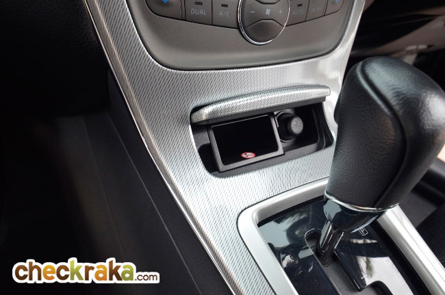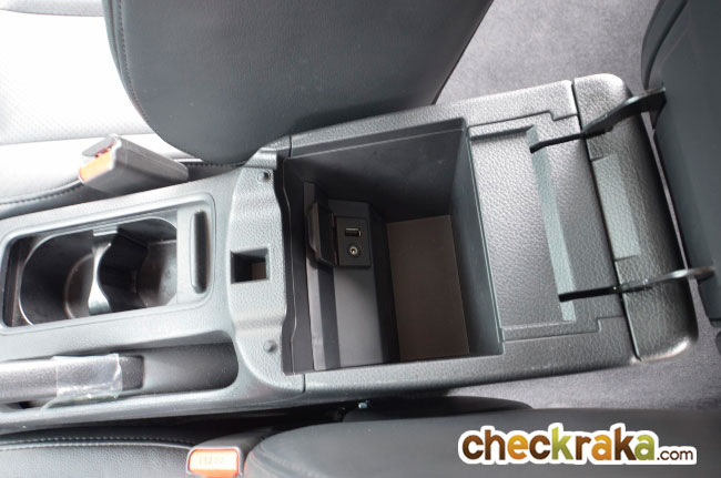 ทางด้านเพดานมีลูกเล่นเยอะตามแบบรถหรูหราด้วยไฟส่องแผนที่ตอนหน้าทั้งซ้าย-ขวา ที่เก็บแว่นตา แผ่นบังแดดมีกระจกพร้อมไฟส่อง ที่คอนโซลกลางมีช่องวางแก้วน้ำ แต่หยิบยากสักหน่อยต้องระวังข้อศอกไปโดนแก้วน้ำที่วางอยู่ ส่วนกล่องเก็บของตรงกลางมีขนาดไม่เล็กไม่ใหญ่เกินไป และติดตั้งจุดเชื่อมต่อ AUX และ USB เอาไว้ด้านใน แถมใส่ที่วางแขนแบบสไลด์หน้า-หลังได้ตามต้องการ