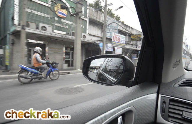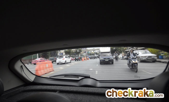 กระจกมองข้างทั้งซ้ายและขวามองชัดเจน เป็นกระจกกึ่งๆ โค้งนิดๆ จึงเห็นได้กว้างขึ้น แต่ไม่หลอกตาจนเกินไป ในส่วนกระจกด้านหลังแม้จะเป็นบานแบนๆ แต่ความกว้าง และช่องกระจกเล็กตรงระหว่างเสา C และ D ตรงมุมท้ายก็ใหญ่พอที่จะช่วยให้มองเห็นรถที่วิ่งมาในแนวทแยงได้อย่างดี