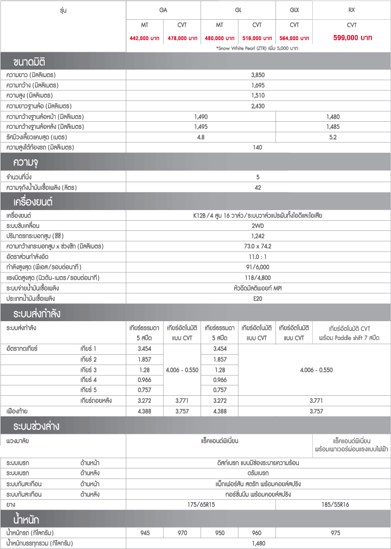 เครื่องยนต์เบนซินรหัส K12B 4 สูบเรียง DOHC 16 วาล์ว พร้อมระบบแปรผัน VVT หัวฉีด MPI 1,242 ซีซี. 91 แรงม้า ที่ 6,000 รอบ/นาที แรงบิด 118 นิวตันเมตร ที่ 4,800 รอบ/นาที รองรับน้ำมันเบนซิน E20 เกียร์อัตโนมัติ CVT 7 จังหวะ ขับเคลื่อนล้อหน้า ระบบช่วงล่างด้านหน้าแม็คเฟอร์สันสตรัทพร้อมคอยล์สปริง และด้านหลังทอร์ชั่นบีมพร้อมคอยล์สปริง พวงมาลัยเพาเวอร์ไฟฟ้า ระบบเบรกหน้าแบบดิสก์พร้อมช่องระบายความร้อนและดรัมเบรกหลัง ล้อแม็กขนาด 16 นิ้ว ยาง ขนาด 185/55R16 น้ำหนักตัว 975 กก. (เฉพาะรุ่น)