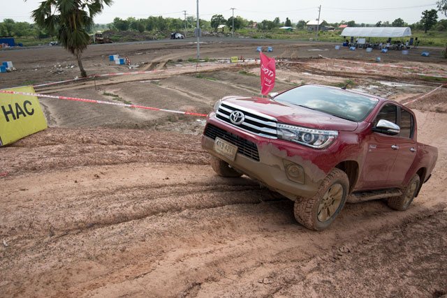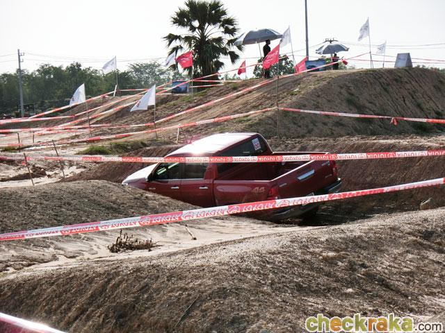 เริ่มต้นด้วยด่านโหดคือ การลุยทางขี้เลนพร้อมมีหลุมลึกหลังจากโดนฝนตกหนัก! จากการขับโดยคำแนะนำของผู้ฝึกสอน รีโว่ ผ่านไปได้อย่างไม่มีปัญหา ทั้งที่ใช้การปล่อยไหลของรอบเครื่องยนต์ในตำแหน่งเกียร์ "D" และใช้เพียงการแตะคันเร่งเบาๆ เพื่อขึ้นจากหล่มโคลนเท่านั้น ต่อมาเป็นการขับลงหลุมลึกที่กลายสภาพเป็น "บ่อโคลน" เพื่อพิสูจน์มุมด้านหน้า-หลังของรีโว่ที่สามารถผ่านไปโดยไม่มีติดตัวกันชนหน้าหรือหลังเลยแม้แต่นิดเดียว และผู้ฝึกสอนยังให้เร่งเครื่องขึ้นอย่างรวดเร็วโดยไม่สนว่าจะครูดกันชนอีกต่างหากครับ