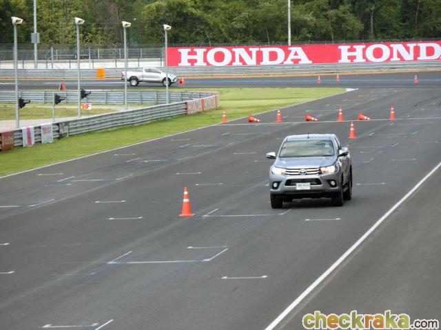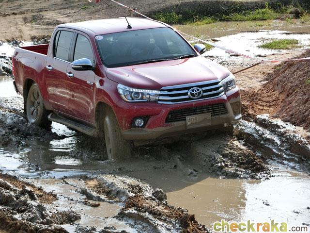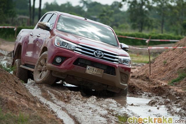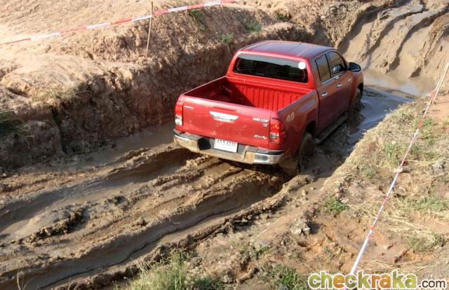 การทดสอบแบบลุยโคลน บ่อน้ำลึก และทางลาดเอียงในสนามจำลองที่จัดขึ้นเพื่อ "ลองของ" เจ้ารีโว่ใหม่ กันแบบดิบๆ ภายใต้คอนเซปต์ "มือใหม่ก็ลุยได้" ไม่ใช้สแตนด์อิน เพราะทางโตโยต้าเปิดโอกาสให้สื่อมวลชนได้ขับด้วยตัวเองคนละ 1 รอบ สนาม และเมื่อมีเวลาเหลือสามารถขอสลับรถรุ่นอื่นๆ ขับได้ด้วย ในครั้งนี้ทีมงานเช็คราคา.คอม "ขอเบิ้ล" โดยรอบแรกในรุ่นดับเบิ้ลแค็บ 4X4 A/T และรอบที่สองในรุ่นดับเบิ้ลแค็บ 4X4 M/T พร้อมผู้ฝึกสอนประกบข้างเช่นเดิมเพื่อแนะนำวิธีการขับที่ถูกต้องและความปลอดภัย รวมทั้งเจ้าหน้าที่ในสนามที่คอยโบกมือให้รถเข้าไลน์ที่ถูกต้อง การขับทดสอบจะใช้โหมด 4X4 ปรับเป็บแบบ H4 และใช้ L4 ในช่วงขึ้น-ลงเนินชันเกินกว่า 30 องศา (โดยประมาณ)