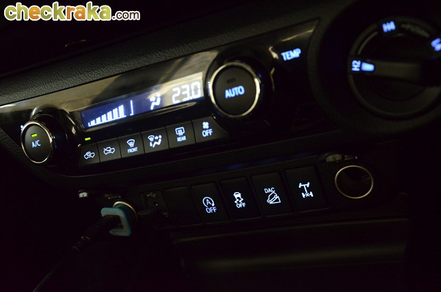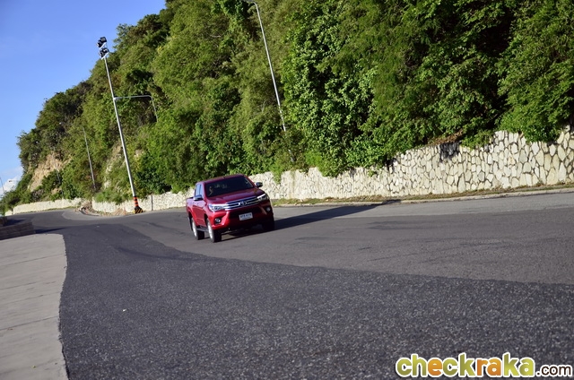 โตโยต้า รีโว่ ดับเบิ้ล แค็บ 2.8G AT ที่หนัก 2 ตันกว่า ทะยานไปข้างหน้าได้อย่างสนุกตื่นเต้น ด้วยแรงบิด 450 นิวตันเมตร ความรู้สึกที่ได้เมื่อกดคันเร่งคือ ดึงเร็วดันยาว ส่วนการเบรกชะลอความเร็วก็ทำได้อย่างนุ่มนวล ตอบสนองดี ให้น้ำหนักได้ง่าย และพอขับด้วยความเร็วคงที่ยาวๆ บางช่วงที่เจอลมปะทะบ้างก็ไม่พบอาการตัวถังโคลงแต่อย่างใด อย่างมากแค่ทำให้ตัวรถไหวตัวบ้าง เมื่อลงมาขับถนนด้านล่างมุ่งหน้าสู่ชายหาดบางแสน จึงมีโอกาสขับผ่านโค้ง แยก และซอยต่างๆ พบว่า รีโว่ ที่มีความยาวเกิน 5 เมตร สามารถเลาะเลี้ยวผ่านไปได้ทุกจุดอย่างไม่ลำบาก ด้วยมุมมองจากตำแหน่งที่สูงกว่าทั่วไป ทำให้ขับได้สบายเพราะเห็นจุดกีดขวางชัดเจนกว่า ส่วนความรู้สึกตรงตำแหน่งผู้ขับเหมือนได้ขับเอสยูวีมากกว่ารถกระบะ ส่วนหนึ่งเพราะภายในห้องโดยสารรุ่นนี้มีความทันสมัยและเพียบพร้อมด้วยอุปกรณ์อำนวยความสะดวกระดับเดียวกับเอสยูวีอย่าง ฟอร์จูนเนอร์ จุดที่ประทับใจคือ การแสดงข้อความเตือนเป็นภาษาไทยบนหน้าปัด ซึ่งทำให้ผู้ขับส่วนใหญ่เข้าใจได้ง่ายและเร็วขึ้น โตโยต้าบอกว่า จากการวิจัยพบว่าผู้ใช้รถส่วนมากมักมองข้ามและเพิกเฉยต่อการแสดงเตือนด้วยสัญลักษณ์ จึงปรับให้เป็นภาษาไทย โดยเริ่มใช้ใน รีโว่
