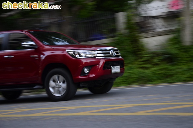 โตโยต้า รีโว่ ดับเบิ้ล แค็บ 2.8G AT ให้ความรู้สึกสบายใจและตื่นตัวในการเดินทาง ต่างจากที่ผ่านมา เพราะผู้เขียนมักใช้รถเก๋งช่วงล่างแบบสปอร์ต เหตุเพราะระยะหลังถนนในเมืองไทยมักมีจุดเสียหายและเจอเหตุการณ์ไม่คาดคิดบ่อยครั้ง โดยเฉพาะเส้นทางสำคัญสู่แหล่งท่องเที่ยว ทำให้การเดินทางโดยรถยนต์แบบเดิมๆ ไม่ค่อยสะดวกนัก เมื่อเทียบกับใช้รถกระบะ 4 ประตู ยกสูง ขับเคลื่อน 4 ล้อ การขับในช่วงแรกผู้เขียนใช้เส้นทางยกระดับสู่จังหวัดชลบุรี เพราะอยากดูการทรงตัวเวลาตัวถังโดนลมแรงปะทะจากด้านข้าง และเลือกเวลาวันธรรมดาในการเดินทางเพื่อความสบายในการขับ และยังมีโอกาสทดสอบอัตราเร่งหลากหลายช่วงได้สะดวก โดยผู้เขียนลองแช่ที่ความเร็ว 80 กม./ชม. ในช่วงถนนโล่ง สักพักจึงเร่งขึ้นไปอย่างเต็มที่ พบว่าเข็มวัดความเร็วสามารถกวาดขึ้นไปได้อย่างรวดเร็วและไปต่อได้เรื่อยๆ จนถึง 180 กม./ชม. ผู้เขียนก็ยกคันเร่งเพื่อความปลอดภัย ไม่น่าเชื่อว่ากำลัง 177 แรงม้า บนตัวถังที่หนักสุดของรีโว่ สามารถฉุด