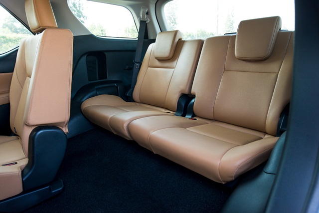 เบาะหนังสีน้ำตาลเข้ม รูปแบบเบาะแบบ 2+3+2 เบาะแถว 2 เลื่อนเข้า-ออก ปรับพนักพิงได้ และยังพับเก็บจังหวะเดียวเพื่อให้เข้า-ออกเบาะแถว 3 ได้อย่างสะดวก เบาะแถว 3 พับแบบยกเบาะขึ้นเก็บด้านข้างเพิ่มพื้นที่ได้อีกมาก