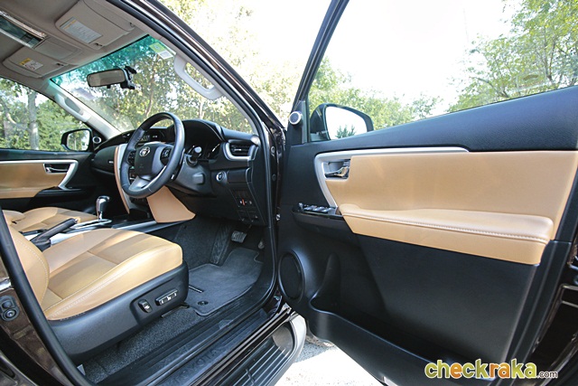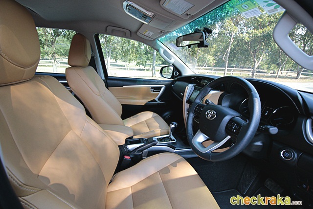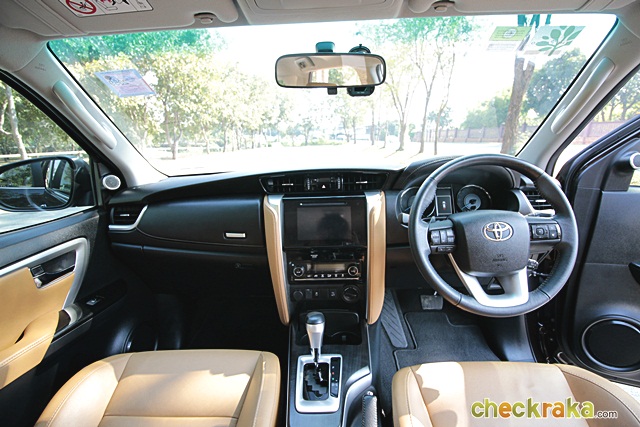 ไฮลักซ์ รีโว่ แต่อันที่จริงมีความแตกต่างค่อนข้างมาก เช่น ตรงช่วงที่อยู่ของชุดเครื่องเสียงและระบบแอร์ เป็นต้น พร้อมกับตกแต่งให้หรูหราขึ้นด้วยการเลือกใช้วัสดุระดับคุณภาพสูงกว่า ให้อารมณ์ Luxury เทียบเคียงแบรนด์หรูร่วมค่ายอย่าง Lexus แผงกันแดดด้านบนมาตรวัดใช้วัสดุนุ่มมือ หุ้มด้วยหนังแท้ ตรงส่วนกลางเหนือช่องแอร์เป็นพลาสติกฉีดขึ้นรูป ที่ฝาที่เก็บของด้านบนใช้วัสดุนุ่มหุ้มหนังเช่นกัน ทำให้ความรู้สึกแตกต่างจากคอนโซลของรีโว่โดยสิ้นเชิง