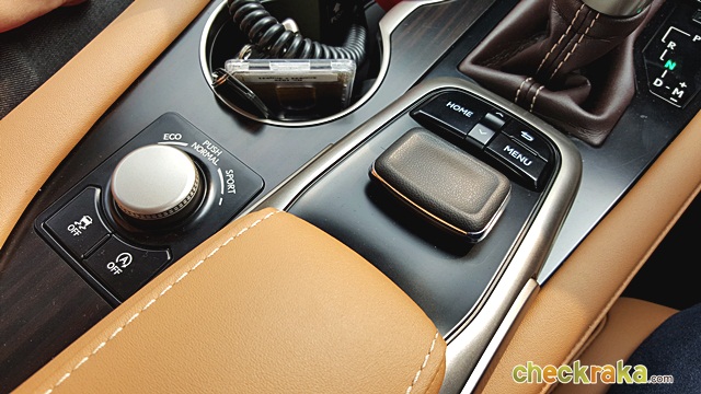 Lexus RX 200t Premium - ปุ่มกลมคือ ปรับโหมดการขับขี่ - สีเหลี่ยมเป็น "เมาส์" ใช้เล่นหน้าจอ EMV บริเวณฐานเกียร์มีปุ่มเลือกโหมดการขับขี่ ECO/NORMAL/SPORT และชุด "เมาส์" ควบคุมจอ EMV ขนาด 12.3 นิ้ว ครบทั้งข้อมูลต่างๆ เกี่ยวกับความบันเทิงและระบบนำทาง ที่ใช้งานง่ายกว่าระบบสัมผัส