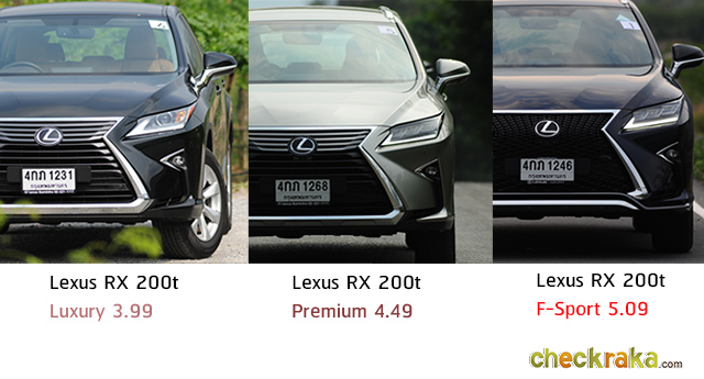 - Lexus RX 200t Luxury/Premium เวลา 9.2 วินาที ความเร็วสูงสุด 200 กิโลเมตรต่อชั่วโมง อัตราสิ้นเปลืองเฉลี่ยจากโรงงาน 12.35 กิโลเมตรต่อลิตร