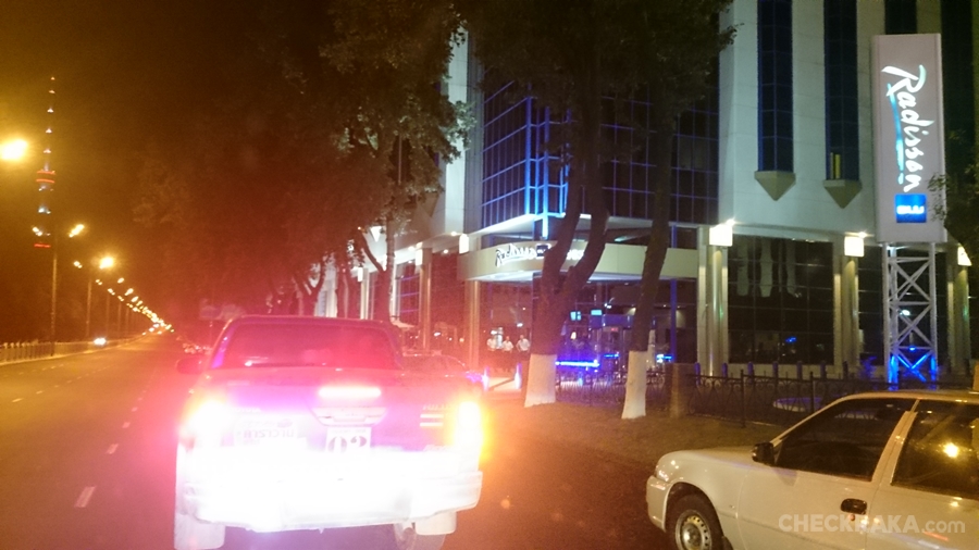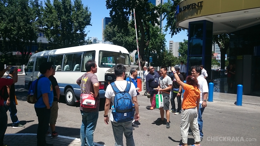 รถทุกคัน สมาชิกทุกคนถึงร้านอาหารก็ทุ่มกว่านับเวลาตั้งแต่เช้ามาก็เกือบ 10 ชั่วโมง เรายังเหลือระยะทางให้ขับกันต่ออีกกว่า 400 กม. สู่ทาชเคนต์ หลังทานอาหาร ขับไปเติมน้ำมันเสร็จสรรพก็ปาไปสามทุ่มกว่า การเดินทางแบบทรหดเพิ่งเริ่ม เส้นทางไม่เหมือนฝั่งประเทศจีนที่ทำความเร็วและขับสบาย การขับรถของคนท้องถื่นก็เป็นอุปสรรคด้วย ช้า ปาดหน้า มีซ่อมถนน ด่านตรวจ โดยเฉพาะด่านเยอะมากต้องจอดทุกด่าน และเจอด่านที่เข้มงวดมากช่วงตีสอง เพราะใกล้พรมแดนทาจิกิสถาน เราโดนบังคับให้ลงจากรถ รายงานตัวพร้อมพาสสปอร์ตรายคน ตลอดเส้นทางต้องสู่กับความเหนื่อยและง่วง ทั้งผ้าเย็น ยานวด ประเคนใช้กันตลอด กว่าขบวนฯ จะถึงโรงแรมเรดิสัน บลู ในทาชเค้นต์ก็เกือบตี 5 ตามเวลาท้องถิ่น 11 ชั่วโมงของการขับสู่จุดหมายสุดท้าย เวลาที่วางไว้ปรับใหม่หมด เราใช้เวลากับการข้ามแดนจนจบภารกิจโดยไม่ได้นอนไป 21 ชั่วโมง หลังจบภารกิจที่เลี่ยงไม่ได้ยังรอต่ออีกคือ ตื่นเช้าไปทัวร์เมือง เลือกอยู่โรงแรมก็ไม่ได้เพราะต้องเช็คอินและไปสนามบินเลย