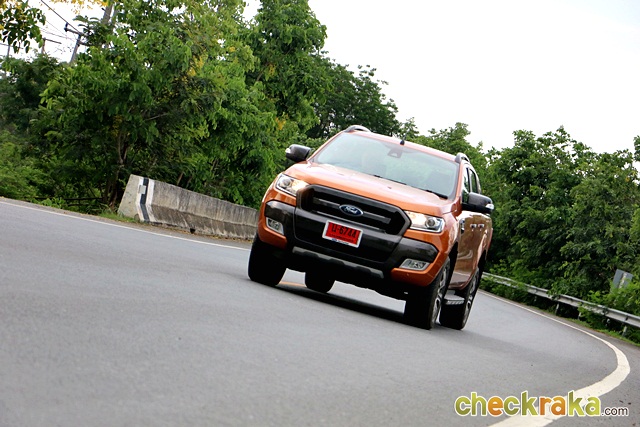 การขับบนทางเรียบพบว่าอัตราเร่งจากเครื่องยนต์พลัง 200 แรงม้า แรงบิด 470 นิวตันเมตร เกียร์อัตโนมัติ 6 สปีด ให้อัตราเร่งที่ดีและเหลือเฟือต่อการใช้งานทางเรียบ ส่วนการเร่งอย่างต่อเนื่องพบว่า ตัวรถพุ่งตอบสนองได้ดี ทะยานขึ้นอย่างราบรื่น แต่เสียงพัดลมหน้าเครื่องดังไปหน่อย ถ้าปรับให้เบากว่านี้ได้คงดีมาก ส่วนการเบรกชะลอ-หยุด ระบบเบรกให้การตอบสนองที่ดีตามน้ำหนักเท้า แม้ตัวรถมีน้ำหนักมากแต่ก็เบรกชะลอได้ตามที่ต้องการ ด้วยพื้นฐานรถกระบะ การทำความเร็วสูงคงไม่ใช่ส่วนสำคัญเท่ากับการได้แรงบิดสูงไว้ฉุดดึงตัวรถ ต่อจากนั้นผู้เขียนได้ไปลองขับบนพื้นที่ออฟโรดต่อ โดยลองขับบนลานดินโล่ง แต่โชคไม่ดีที่ไม่กี่ชั่วโมงก่อนหน้านั้นมีฝนตกลงมาอย่างหนัก จนทำให้พื้นดินหลายจุดอุ้มน้ำไว้ เมื่อขับผ่านจุดที่ดินนิ่มเพราะน้ำขังทำให้ล้อจมจนไม่สามารถไปต่อได้ จึงต้องใช้ระบบขับเคลื่อน 4 ล้อแบบจริงจัง ผู้เขียนเข้า 4L เพื่อดึงตัวรถออกจากอุปสรรค การพยายามครั้งแรกดูไม่เป็นผล ทำให้ต้องลงมาปรับแต่งพื้นดินรอบล้อและหาไม้กระดานรองใต้ล้อ จากนั้นค่อยๆ เดินคันเร่งใหม่ ไม่นานตัวรถก็เริ่มขยับและถอยออกมาจากอุปสรรคได้สำเร็จ ด้วยศักยภาพของเครื่องยนต์ดีเซล TDCi 3.2 ลิตร และระบบขับเคลื่อน 4 ล้อ Shift-on-the-fly ในฟอร์ด เรนเจอร์ ไวลด์แทรค ทำให้การเผชิญอุปสรรคในพื้นที่ออฟโรดครั้งนี้ผ่านไปได้ด้วยดี และสามารถขับกลับได้อย่างปลอดภัย นับเป็นการทดสอบรถที่ประทับใจมากอีกครั้ง