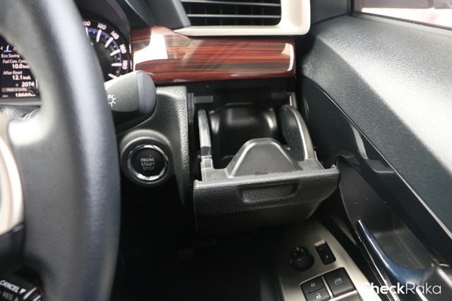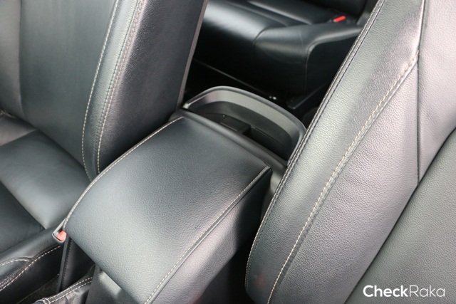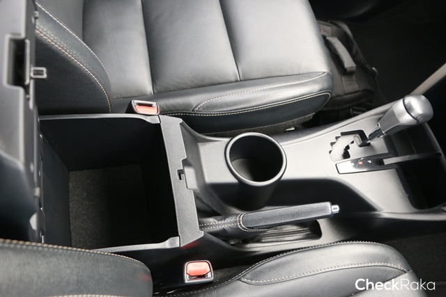 คอนโซลกลางมีช่องวางแก้วน้ำและกล่องใส่ของขนาดใหญ่ ใส่กล้องถ่ายรูปได้สบายๆ และวัสดุด้านบนออกนุ่มๆ และคันดึงเบรกมือแบบ "แมนนวล" ใช้ดีใช้ทน
