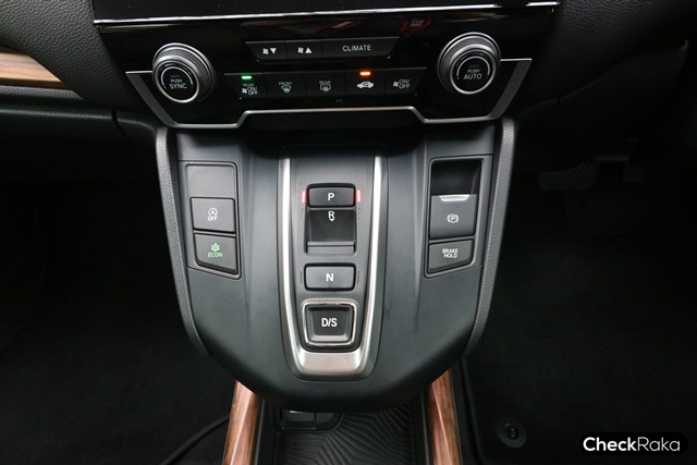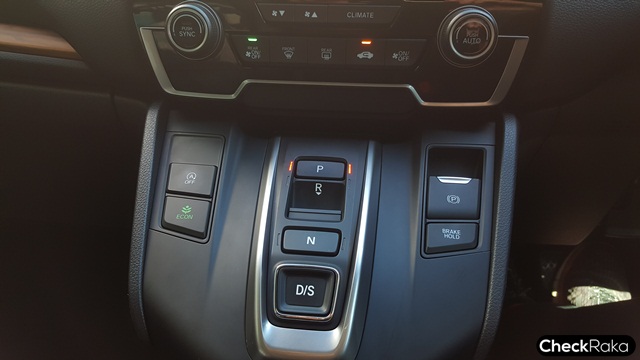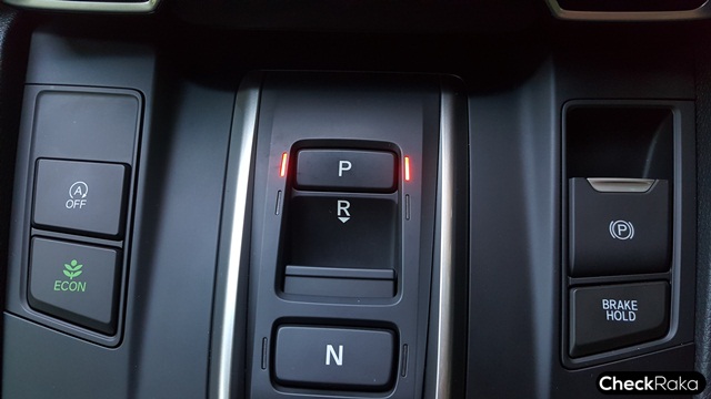 แผงควบคุมสวิตช์เกียร์เรียบง่าย เป็นแบบกดปุ่ม ใช้งานไม่ยากต้องการใช้งานอะไรก็กดตามนั้นได้เลย ตำแหน่ง "P" เกียร์จอดหรือ Park ตำแหน่ง "R" คือ เกียร์ถอยหลังเพียงเลื่อนปุ่มลงเข้าหาตัวเบาๆ เท่านั้น ตำแหน่ง "N" เกียร์ว่าง ส่วนตำแหน่ง "D/S" ก็คือ Drive ขับไปข้างหน้า และหากต้องการโหมดสปอร์ตก็เพียงกด "D/S" ซ้ำอีกครั้ง บนหน้าปัดก็ขึ้นตัว "S" และนอกจากนี้ยังมีปุ่มสั่งปิดระบบ Idling Stop หากไม่ชอบใช้ รวมถึงปุ่มเบรกมือไฟฟ้า และ Brake Hold