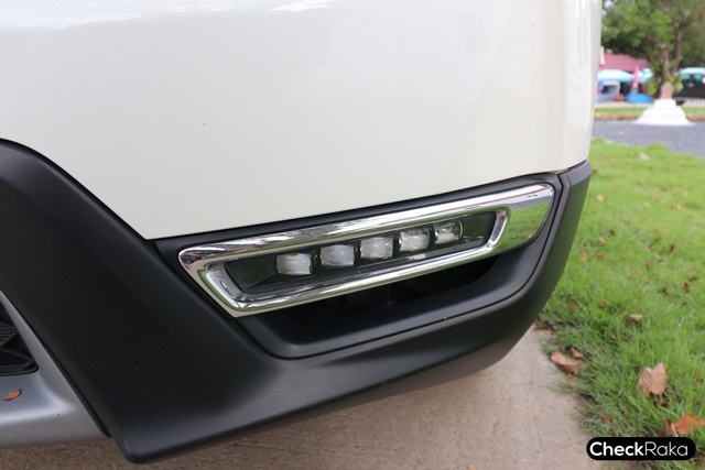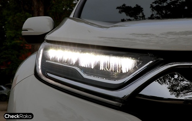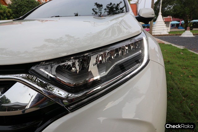 เมื่อมองจ้องหน้า คำว่า "กันดั้ม" ก็แวบขึ้นมาในหัวทันที รูปทรง CR-V ใหม่ เน้นความเหลี่ยมคมมากขึ้น และไฟหน้า LED เรียงเม็ดที่ดูราวยานอวกาศ พร้อมกับโหนกแก้มบนฝากระโปรงเหนือซุ้มล้อขนาดใหญ่ ยิ่งดูบึกบึน กันชนเล่นเส้นสายตามแนวกระจังหน้า พิเศษด้วยไฟตัดหมอก LED สี่เหลี่ยมผืนผ้า