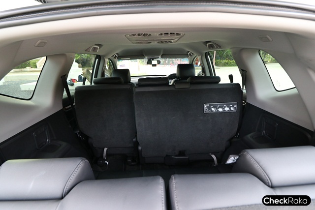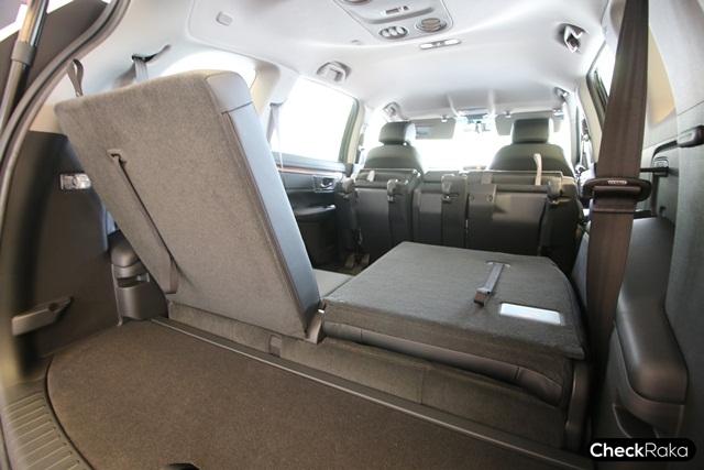 ภายในสวยหรูมากๆ ใช้วัสดุอย่างดี คอนโซลกลางวางแก้วน้ำได้ 2 ใบ และมีกล่องเก็บของขนาดใหญ่ เบาะแถวที่ 2 ขนาดกว้างนั่งสบาย ปรับเลื่อนหน้า-หลังได้และปรับเอนได้ พร้อมกับการปรับพับเก็บได้ในหลากหลายรูปแบบ ส่วนเบาะแถวที่ 3 นั้นคนตัวใหญ่สูงราวๆ 176 ซม. พอนั่งได้ไม่แคบเกินไป แต่ต้องเลื่อนเบาะแถวที่ 2 ไปด้านหน้ามากหน่อย โดยเบาะก็สามารถพับเก็บได้เช่นกัน