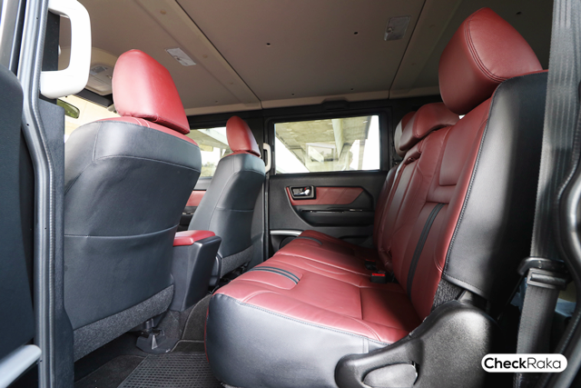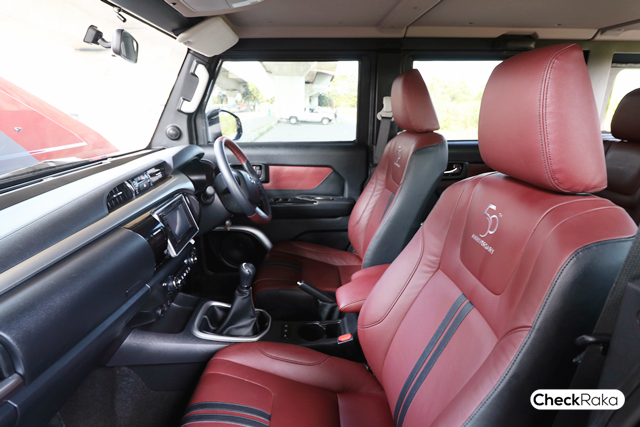 Thairung Transformer II Limited รุ่นพิเศษ 5 ที่นั่ง นอกจากจะมีดีไซน์ภายนอกที่โดดเด่น ขับไปไหนใครๆ ก็เหลียวมองแล้ว ภายในยังได้รับการออกแบบให้มีความหรูหราและสปอร์ตยิ่งขึ้นด้วย เบาะนั่งหนังแท้แบบ 2 แถว ใช้สีทูโทน แดง-ดำ เหมือนสีภายนอกตัวรถ เบาะนั่งคนขับปรับระดับได้ ไม่มีระบบไฟฟ้า แต่ก็ช่วยรองรับสรีระผู้ขับขี่ และช่วยเพิ่มมุมมองให้ขับขี่ได้สะดวกขึ้น เบาะคู่หน้าปักโลโก้รุ่น 50 ปี
