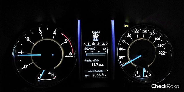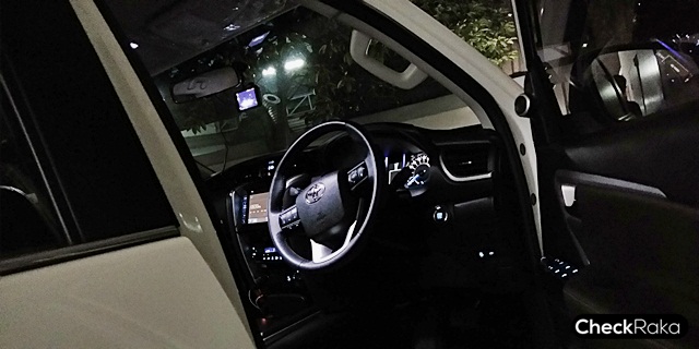 ยามค่ำคืนนั้นระบบไฟหน้า LED ของฟอร์จูนเนอร์สว่างสมคำร่ำลือ (แยงตา) แต่สำหรับคันที่ทดสอบนั้นได้มีการปรับปรุงแก้ไขระดับไฟหน้ามาแล้ว โดยดูจากการที่จอดติดท้ายรถเก๋ง ลำแสงไฟหน้าจะไปถึงกระจกมองข้างหรือกระจกมองหลังรถคันด้านหน้า (หากไม่จอดชิดมากๆ) หรือดูจากระยะลำแสงที่ส่องผิวถนนเมื่อรถโล่งๆ จะกดต่ำลงพื้นมากขึ้นกว่าเดิมพอสมควรครับ เพราะเมื่อขับผ่านเส้นทางมืดมากๆ จำเป็นต้องคอยเปิดไฟสูงดูทางเป็นระยะๆ