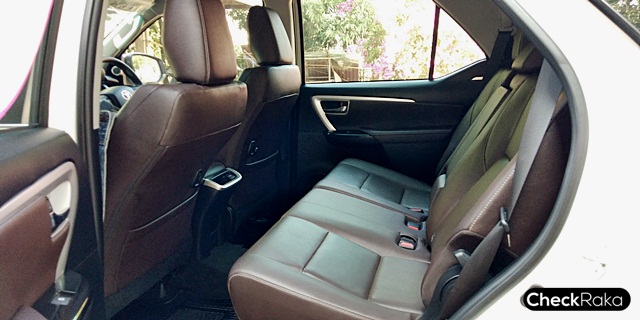 สำหรับภายในของฟอร์จูนเนอร์รุ่น 2.4 ลิตร ขับเคลื่อน 4 ล้อนับว่าไม่แตกต่างด้วยโทนหนังสีน้ำตาลเข้มที่ดูสวยหรูหราและน่าจะเปื้อนได้ยากกว่าสีครีมในรุ่น 2.8 ลิตร ขับเคลื่อน 4 ล้อ ชุดคอนโซลหน้า-กลาง และแผงประตูจะดูเรียบหรูและน่าใช้มากขึ้น