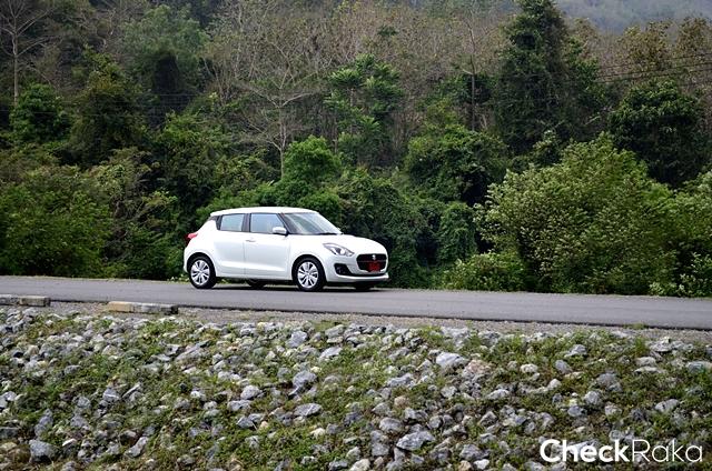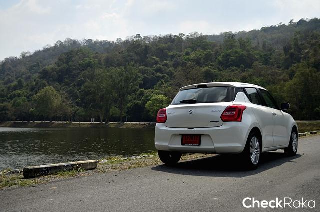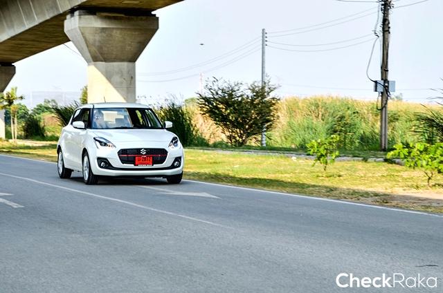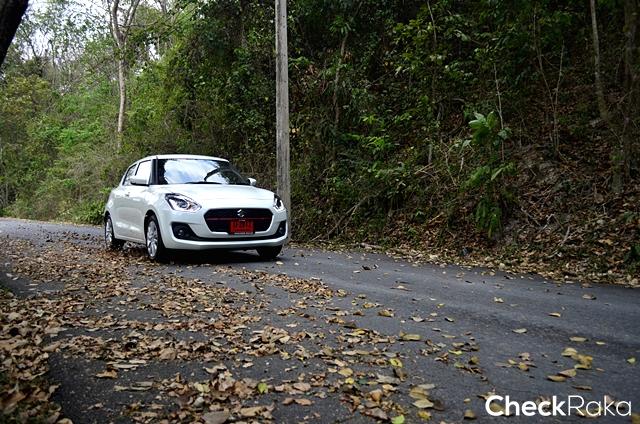 การขับทางไกล ผู้เขียนใช้เส้นทางถนนมิตรภาพสู่สระบุรี โดยเลือกปลายทางเป็นอุทยานน้ำตกสามหลั่น ที่คุ้นเคย มีความเงียบสงบและมีบรรยากาศสวยงาม เส้นทางไม่ไกลจากกรุงเทพฯ มากนัก ผู้เขียนใช้ทางถนนวิภาวดีรังสิตจากดินแดงตรงยาวออกสู่ถนนมิตรภาพ ช่วงแรกขับจากพื้นที่จราจรหนนแน่น และค่อยๆ เบาบางจนเริ่มผ่านช่วงแยกไปอยุธยาจึงเริ่มทำความเร็วได้มากขึ้น ภายในรถมีทีมงานมาพร้อมกันอีก 2 คน ผู้เขียนจับความรู้สึกในช่วงเร่งแซงรถช้าและเปลี่ยนเลนแซง สวิฟท์ ใหม่ให้การแฮนด์ลิ่งที่ดี ตอบสนองได้ฉับไวเกินความคาดหมาย การถ่ายกำลังของเกียร์ซีวีทีเป็นไปอย่างราบรื่นและต่อเนื่องดี ไม่มีอาการรอรอบหรือผิดจังหวะเหมือนที่เคยเจอในบางยี่ห้อ ระบบช่วงล่างตอบสนองได้ดีเยี่ยม ให้ความรู้สึกแน่นหนึบกำลังพอดี โดยเฉพาะการขับด้วยความเร็วต่อเนื่อง ยิ่งเจอถนนที่เป็นลอนคลื่นยิ่งชัดเจน เมื่อถึงจังหวะชะลอเบรก ระบบดิสก์เบรก 4 ล้อ ตอบสนองได้อย่างดี ให้น้ำหนักและคุ้นเคยง่าย ไม่มีให้ลุ้น การขับเข้าโค้งด้วยความเร็วระดับ 80 กม./ชม. ก็ทำได้ดีและให้ความมั่นใจเพราะเกาะหนึบเข้าไปได้โดยไม่มีอาการใดๆ ให้กังวล