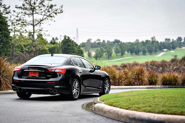 เมื่อถึงสนามกอล์ฟนิกันติ ผู้เขียนได้พักถ่ายรูปและสลับรุ่นรถกับเพื่อนสื่อมวลชนที่ขับมาด้วยกัน เพื่อใช้ขับกลับซึ่งเป็นรุ่นเครื่องยนต์เบนซินเทอร์โบพลัง 350 แรงม้า ที่เหนือกว่ารุ่นดีเซล ผู้เขียนใช้เส้นทางใหม่ขับกลับจากสนามฯ โดยใช้ทางด่วนศรีรัช-วงแหวนรอบนอก แล้วต่อด้วยทางด่วนขั้นที่ 2 ไปลงคลองเตย เส้นทางส่วนใหญ่จึงค่อนข้างเปิดโล่งและทำความเร็วได้ดีเกือบตลอด ทำให้ได้ลองอัตราเร่งตั้งแต่ช่วงกลาง-สูง รวมถึงการเข้าโค้งความเร็วระดับ 120 กม./ชม. พร้อมทั้งเบรกความเร็วสูง พอสรุปได้ว่า ความรู้สึกที่ได้จากการขับรุ่นเครื่องยนต์เบนซินนั้นให้ความแรงอย่างน่าประทับใจ ทั้งการตอบสนองของเครื่องยนต์และเสียง แตกต่างจากตัวดีเซลอย่างชัดเจนการทำงานของเครื่องยนต์ไหลลื่นและให้แรงบิดที่ดีอย่างต่อเนื่องแม้ไม่หนักแต่มาเรื่อยๆ การเลี้ยวเข้าโค้งตัวรถเกาะหนึบเข้าไลน์ได้นิ่ง เดินคันเร่งออกโค้งได้อย่างมั่นใจในระบบช่วงล่างและระบบขับเคลื่อน ทำให้การขับสนุกสนานมากขึ้น จนลืมไปว่านี่คือ ซีดานขนาดใหญ่ เพราะปกติรถมิติขนาดนี้มักขับเน้นสบายมากกว่า แต่ Ghibli ใหม่นอกจากความสบายแล้วยังให้อารมณ์สปอร์ตในการขับที่น่าพอใจด้วย