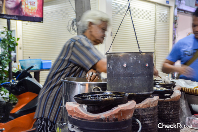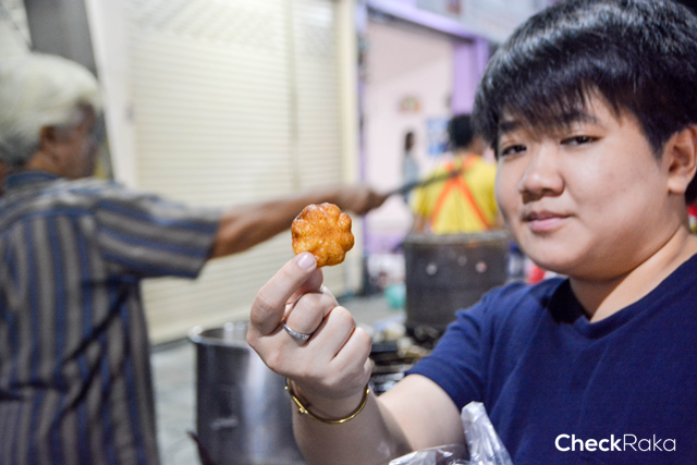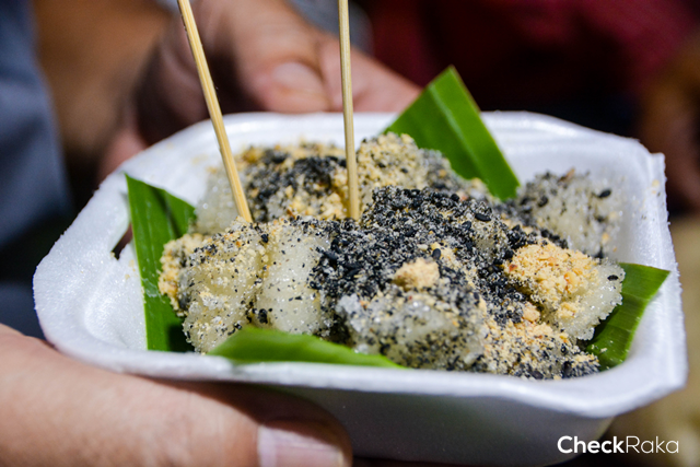 เดินไปเรื่อยๆ จะเจอร้านรถเข็นเล็กๆ แต่คนรอต่อแถวกันเพียบ 2 สาวร่างท้วมไม่รอช้า รีบจ้ำอ้าว ตามกลิ่นไปจนถึงร้านรถเข็น ที่ติดป้ายคำอ่านไม่คุ้นเท่าไหร่นัก "กาลอจี๊" ขนมโบราณประจำท้องถิ่น ที่เริ่มจะหาทานยาก ทำจากแป้งข้าวเหนียว นำมาทอดพอหอมเหลือง และมาคลุกเคล้ากับน้ำตาล ชุบงาขาวปนงาดำ พอเคี้ยวให้มีรสชาติ หรือจะทานแบบแป้งนุ่มๆ ตัดชิ้นพอดีคำ คลุกเคล้าส่วนผสมเช่นเดียวกัน ทานร้อนๆ ในอากาศเย็นๆ ปักหมุดไว้เลยค่ะเมนูนี้ ที่สำคัญแม้ค้าแอบกระซิบมา จะมาทาน "กาลอจี๊" ร้านนี้ มาแค่วันเสาร์ ถนนคนเดินปากแพรก วันเดียวเท่านั้น มาวันอื่นก็อดกิน เพราะแม่ค้าออก Event ทุกที่ (อยากทานของดีก็โทรตามได้เลยที่เบอร์โทรตามป้าย ) แน่ะ! มีโฆษณาแฝง....