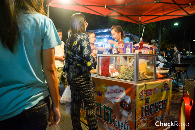 ช่วงเย็นตลาดเริ่มครึกครื้น เราเดินสำรวจตั้งแต่ต้นทาง จะพบร้านปลาหมึกแห้ง ปลาหวาน กับชายหนุ่ม! (เหลือน้อย) อารมณ์ดี เชื้อเชิญสาวน้อยอย่างเราให้ลองลิ้มชิมรสปลาหมึกแห้งชุบน้ำหวาน 3 รส ที่ไม่เหนียวและไม่หวานเลี่ยนจนเกินไป เพราะมีความเผ็ด และเค็มนิดๆ ในตัวปลาหมึก ตัดกันได้พอดี หรือจะแค่ย่างไฟหอมๆ เคี้ยวกรุบๆ ราคาเพียงไม้ละ 10 บาทเท่านั้น ยิ่งอากาศครึ้มๆ เย็นๆ ได้ปลาหมึกแห้งย่างไฟหอมๆ ก็ฟินน่าดูค่ะ