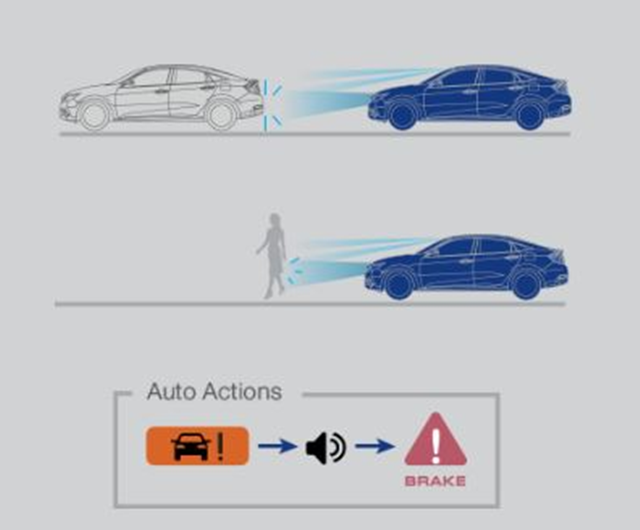 ระบบที่จะช่วยเตือนผู้ขับขี่ให้ลดความเร็วของรถเมื่อมีรถคันข้างหน้า หรือคนเดินถนนอยู่ในระยะที่ไม่ปลอดภัย โดยระบบจะแจ้งเตือนผ่านหน้าจอแสดงข้อมูลและสัญญาณเสียง รวมถึงมีการสั่นเตือนของพวงมาลัยในกรณีที่มีรถสวนทาง ซึ่งหากผู้ขับขี่ยังไม่ตอบสนองหรือในกรณีที่อยู่ในระยะที่เสี่ยงต่อการชน ระบบจะช่วยเสริมแรงเบรกให้อัตโนมัติ เพื่อหลีกเลี่ยงการชนหรือลดความรุนแรงจากอุบัติเหตุ