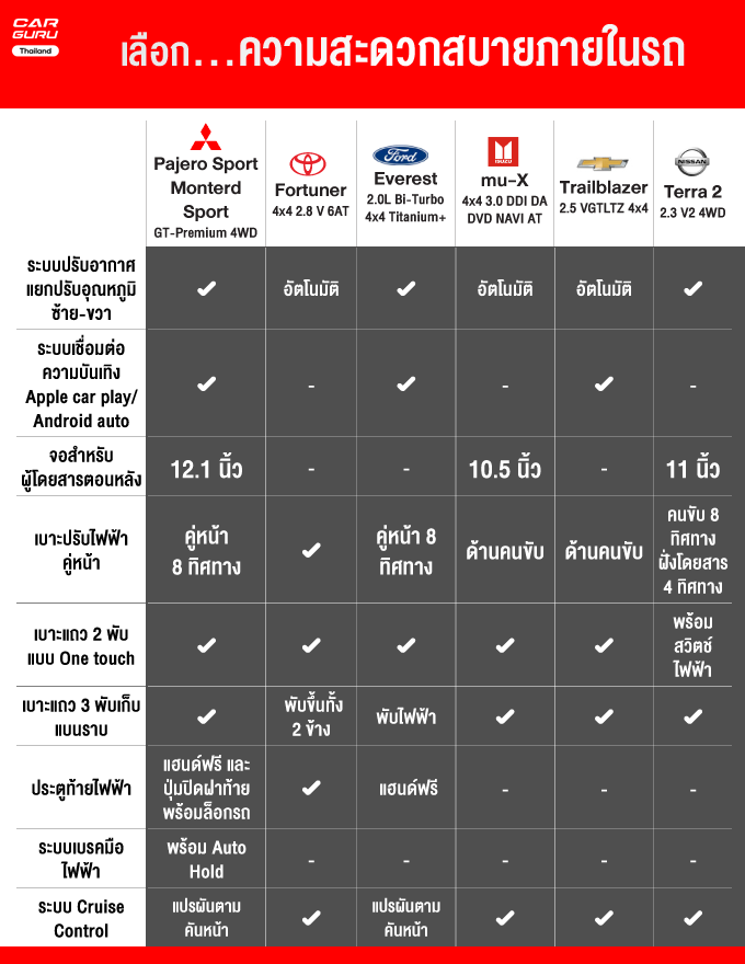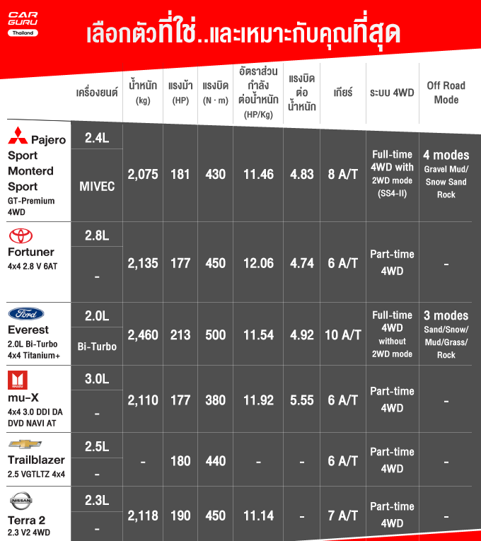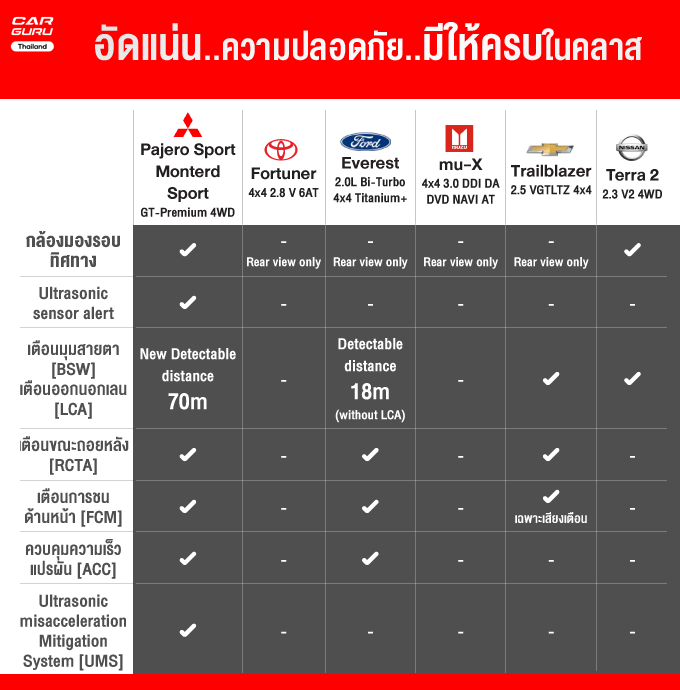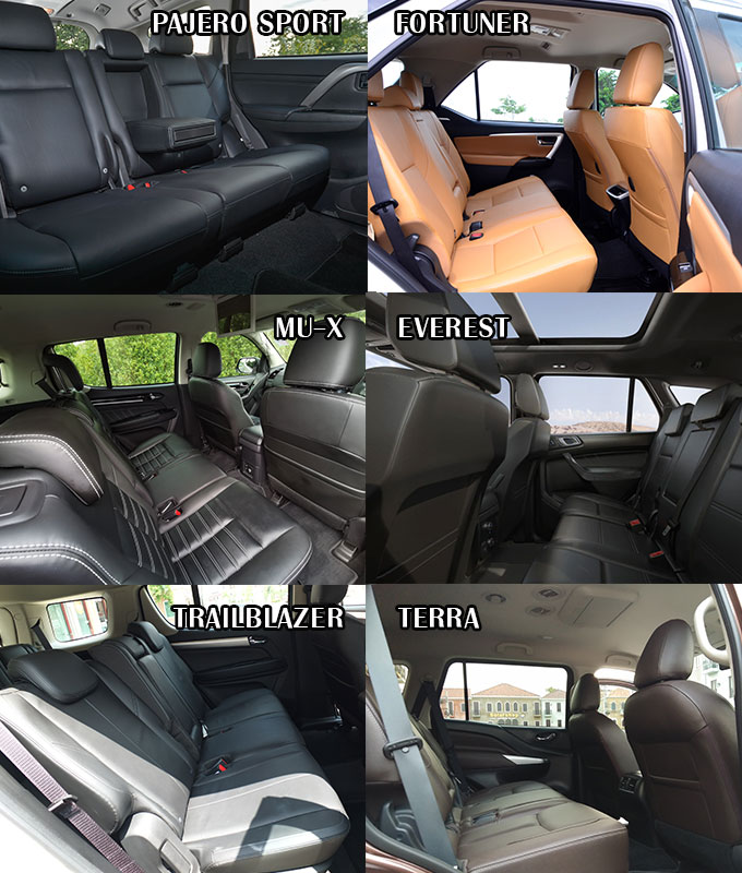 เมื่อเทียบกันในคลาสรถอเนกประสงค์แล้วระหว่าง New Mitsubishi Pajero Sport รูปทรงพรีเมี่ยมหรูหราขึ้นให้ออปชั่นจัดเต็มมากในราคาไม่สูงนัก Toyota Fortuner รถเจ้าตลาดให้ความหรูหรา สะดวกสบาย, Isuzu MU-X ที่เป็นหนึ่งในเรื่องของความประหยัดและนุ่นมนวล Ford Everest ที่ขึ้นชื่อเรื่องเทคโนโลยีเหนือใครแม้ราคาจะโดดกว่าใครแต่ก็ได้หลังคาแก้วมาด้วย Chevrloet Trailblazer ได้ความดิบๆ เน้นแรงขับสนุกใช้ง่ายไม่ซับซ้อน ส่วน Nissan Terra ให้ความบึกบึนแข็งแกร่ง