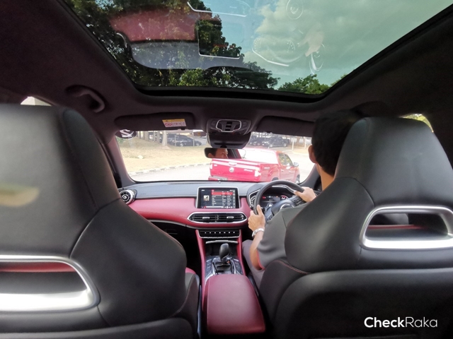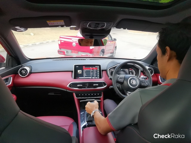 นอกจากจะได้ลอง Cruise Control กันแล้ว (มันก็ช่วยลดความเมื่อยได้จริงๆ) อีกสิ่งหนึ่งที่ใครได้นั่งหลังพวงมาลัยเจ้า MG HS ก็อยากจะกดปุ่มแดงๆ ที่อยู่ตรงหน้าซะเหลือเกิน ทีมงานเราก็ไม่พลาดเพราะมือซน! บวกทักษะที่มีมาพอประมาณ และการเอาตัวรอดเล็กน้อย บวกกับเครื่องยนต์ 1500 แต่ให้เทอร์โบเปลือยหอยมาเสริมกำลังนอกจากอัตราเร่งที่ดีเป็นทุนเดิม ขอพูดเลยว่าเจ้าปุ่มแดงๆ กดปุ๊บ! แซงมิดไมล์ได้เลยทีเดียว เสียงของเครื่องยนต์มีการเปลี่ยนให้เร้าใจทุกจังหวะและสามารถลากรอบได้ยาวขึ้น มันเร็วจนคุณแค่กระพริบตา ก็จะถึงตูดรถคันหน้าแล้ว แต่ที่ตัวรถ MG HS ถูกเซ็ทให้โหมด Sport ทั้งหลายใช้ Paddle shift ได้เพื่อให้ช่วยลดความเร็ว และทำให้การขับขี่สนุกมากขึ้น จังหวะการแซง การแทรกตัว ด้วยช่วงล่างก็เซ็ทมาให้เหมาะกับการใช้งาน จึงทำให้รถคล่องตัว คันใหญ่มุดสบาย