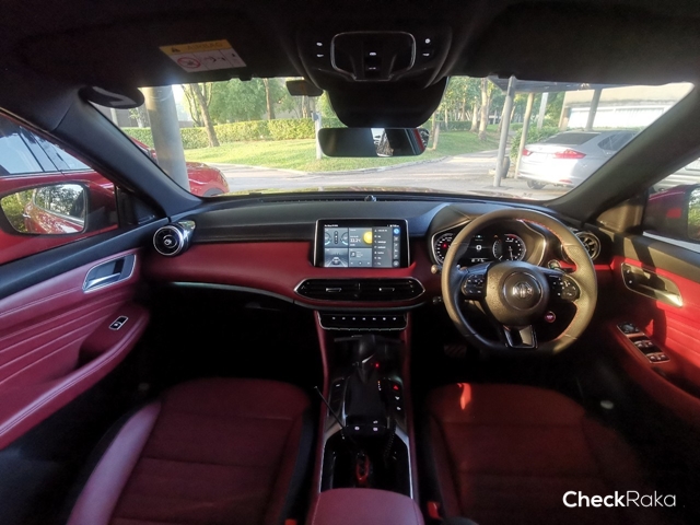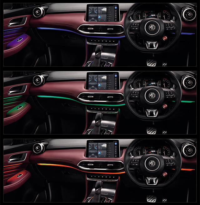 และของเล่นที่ MG โชว์ให้เราเห็นมาตั้งแต่ครั้งแรกนั่นก็คือ ไฟห้องโดยสารที่สามารถปรับสีได้ถึง 64 เฉด สามารถปรับตามอารมณ์สุนทรีย์ของคุณ ณ ขณะนั้นได้ ผ่านจอคอนโซลกลาง 10 นิ้ว ที่ตั้งค่าต่างๆ ได้มากมาย ทั้งดูกล้องแบบ 360 องศา (เลือกสีรถได้ด้วยนะเพราะเขาทำภาพมาแบบ 3 มิติ) ดูสภาพอากาศในแต่ละวัน แถมมีอินเตอร์เน็ตให้เล่นฟรี 5 ปี ลิ้งก์เข้ากับเว็บไซต์ต่าง ๆ ได้เลย (จะดูหวยและละงวดก็ได้นะจ๊ะ อิอิ) และที่สำคัญรถมีระบบ i-Smart ที่สั่งการด้วยเสียงแบบภาษาไทย ที่ฉลาดล้ำขึ้น "Hello MG เปิดซันรูฟให้หน่อยจ๊ะ" (ซันรูฟจะมีเฉพาะรุ่น X)