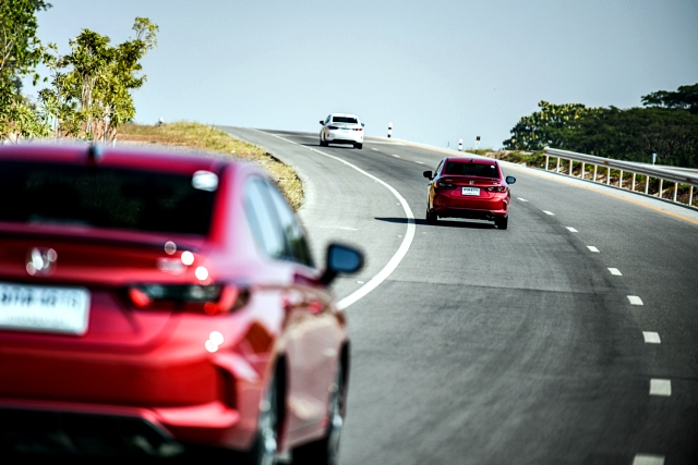 ซิตี้ เทอร์โบ รุ่น RS สีแดง โดยสลับขับกับเพื่อนสื่อมวลชนอีกท่าน แรกจากตำแหน่งที่นั่งผู้โดยสารตอนหน้า การขับโดยรวมใช้ถนนหลวงจากในสู่เชียงของ ถนนส่วนใหญ่ใหม่ และเป็นทางเปิดโล่งทำความเร็วได้หลากหลาย ซ้าย-ขวา สสับขึ้นลงเนิน ให้ได้ทดลองการควบคุมตัวรถ เบรก ในช่วงความเร็วปานกลาง-สูง