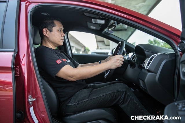 ท่านั่งขับนั้นได้ระดับพอดีเพราะพวงมาลัยปรับได้ 4 ทิศทาง จึงไม่เป็นปัญหา แต่ว่าตัวเบานั้นมีขนาดเล็กไปหน่อย ผู้ทดสอบสูง 176 ซม. และขนาดตัว... ตามรูป นั่งแล้วไหล่เลยเบาะพิง และหมอนพิงหัวระดับต่ำ ต้องปรับเลื่อนขึ้นเล็กน้อยจึงจะพอดีตัว โดยรวมท่าขับระยะห่างและการควบคุมพวงมาลัยอยู่ในเกณฑ์ดี แต่เบาะขนาดเล็กนั่งนาน ๆ จะไม่สบายเท่าไหร่ครับ