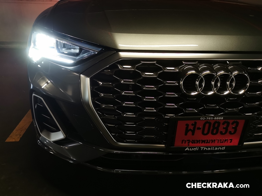 Q3 Sportback 35 TFSI S-Line รูปทรงทีให้ความสปอร์ตปราดเปรียว หลังคาลาดเอียงแบบรถคูเป้ ในความพิเศษเฉพาะใน Sportback ที่แตกต่างจาก Q3 รุ่นปกติ โดดเด่นด้วยกระจังหน้าแบบรังผึ้งสไตล์เดียวกับ