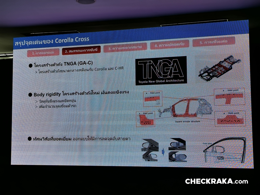 All-New Toyota Corolla CROSS รถยนต์ C-SUV ยิ่งใหญ่ครั้งแรกของโลกที่ประเทศไทยที่พัฒนาบนพื้นฐานของสถาปัตยกรรมโครงสร้างยานยนต์ใหม่ TNGA (Toyota New Global Architecture) โดยโคโรลล่า ครอสใหม่ ถูกพัฒนาขึ้นจากพื้นฐานของ โคโรลล่า อัลติสและซี-เอชอาร์ มาพร้อมกับเครื่องยนต์ขนาด 1.8 ลิตร ทั้งแบบเบนซิน และแบบไฮบริดรุ่นล่าสุดเจเนเรชันที่ 4 ที่ให้ทั้งอัตราเร่งที่ตอบสนองได้ทันใจและประหยัดน้ำมัน
