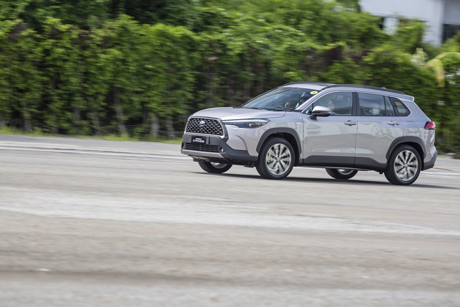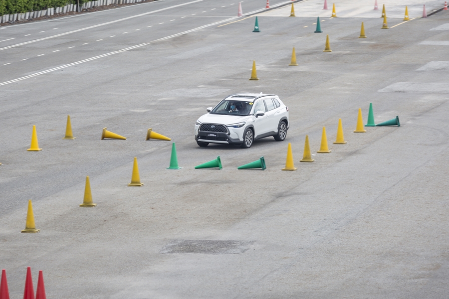 การทรงตัวของรถ Corolla Cross ที่เป็น SUV ยกสูงนั้น จากการที่ปรับระบบช่วงล่าง (ตามที่โตโยต้าคุยเอาไว้) ทำให้เมื่อเข้าโค้งในระหว่างสลาลอม ตัวถังรถมีความเอียงน้อยลงอย่างรู้สึกได้ นั่นคือ มีความเหวี่ยงของตัวรถน้อยลง และสามารถควบคุมพวงมาลัยให้ "จิก" เข้าโค้งระหว่างกรวยยางได้ง่ายและกระชับขึ้น ไม่รู้สึกว่ากำลังขับรถ SUV อยู่เลย และใช้การหมุนองศาพวงมาลัยไม่มากนักก็สามารถควบคุมทิศทางได้ตามต้องการ