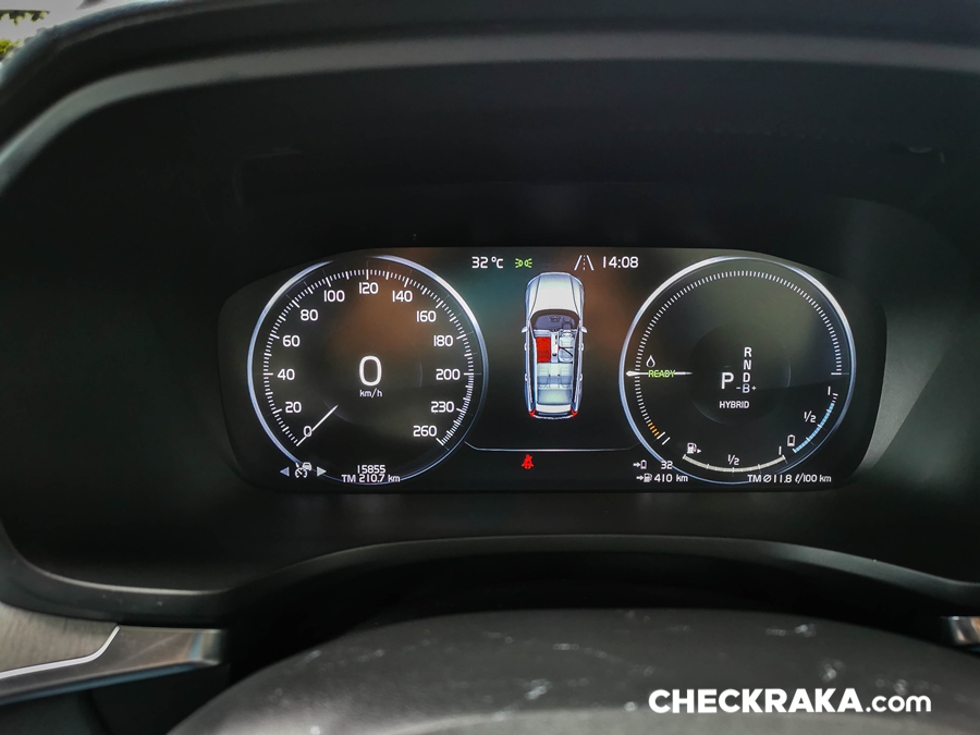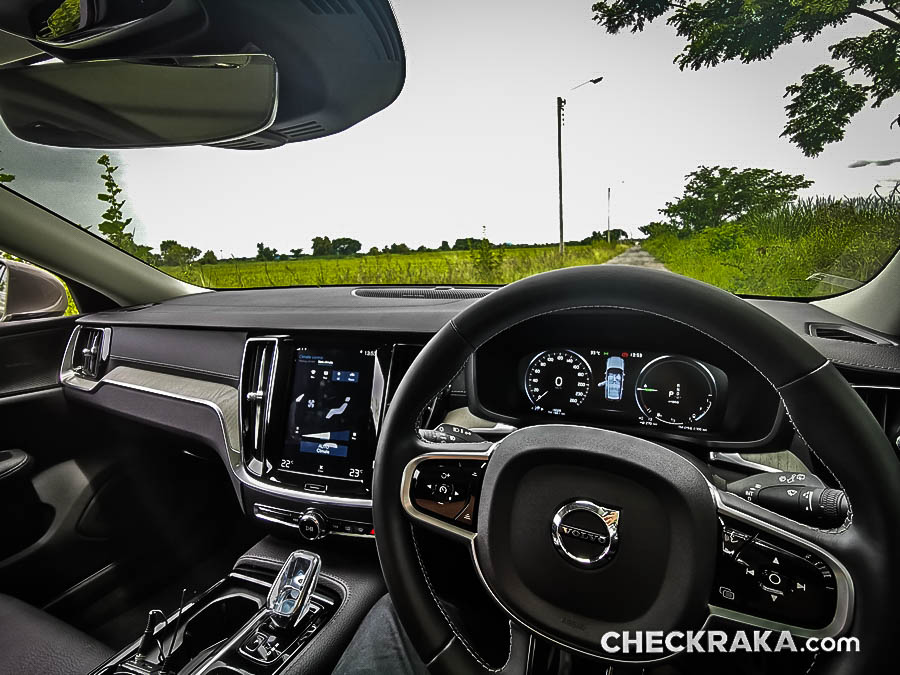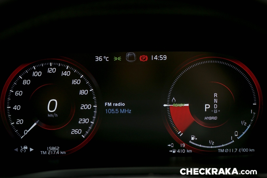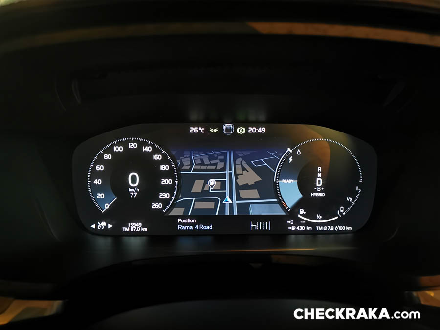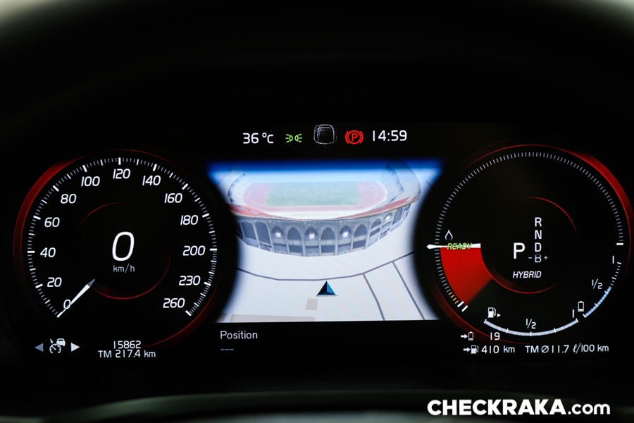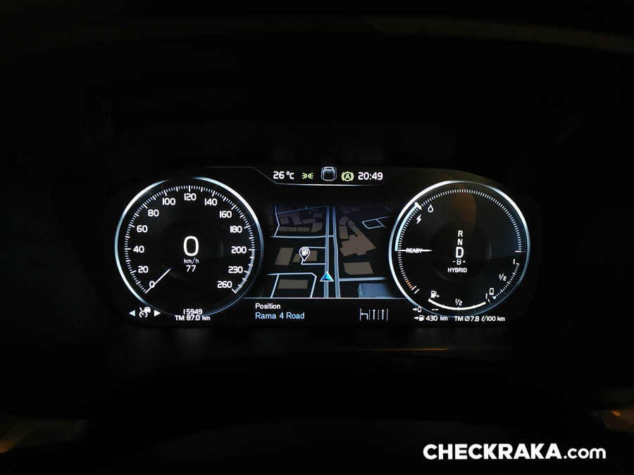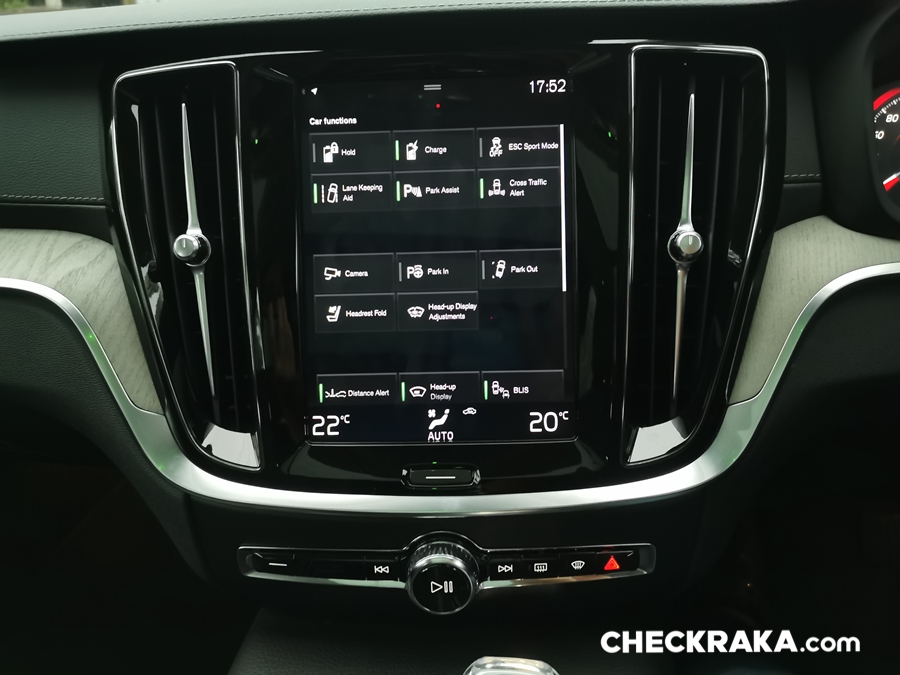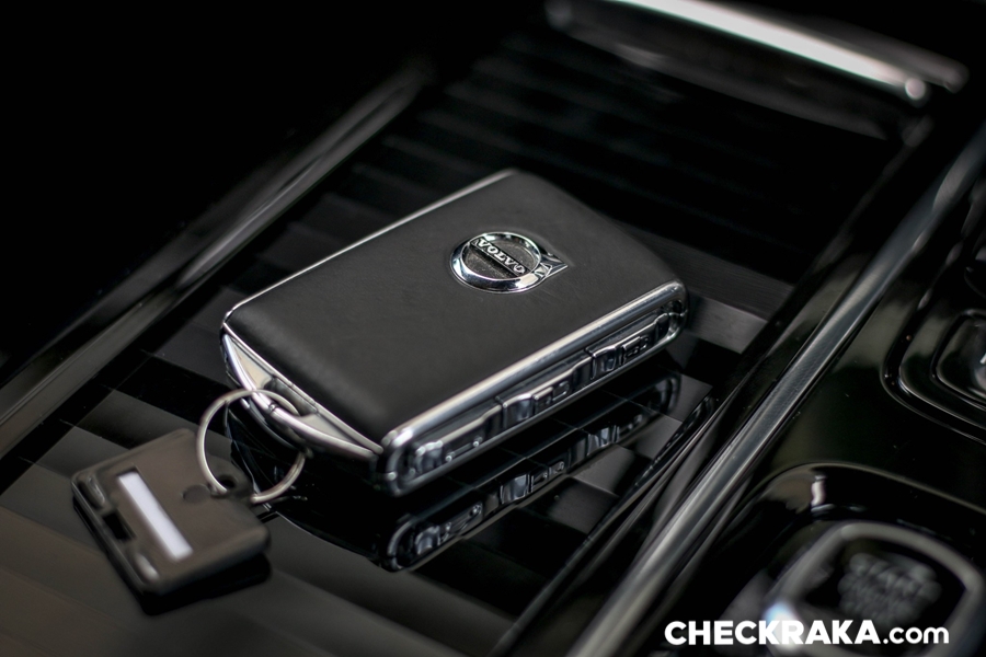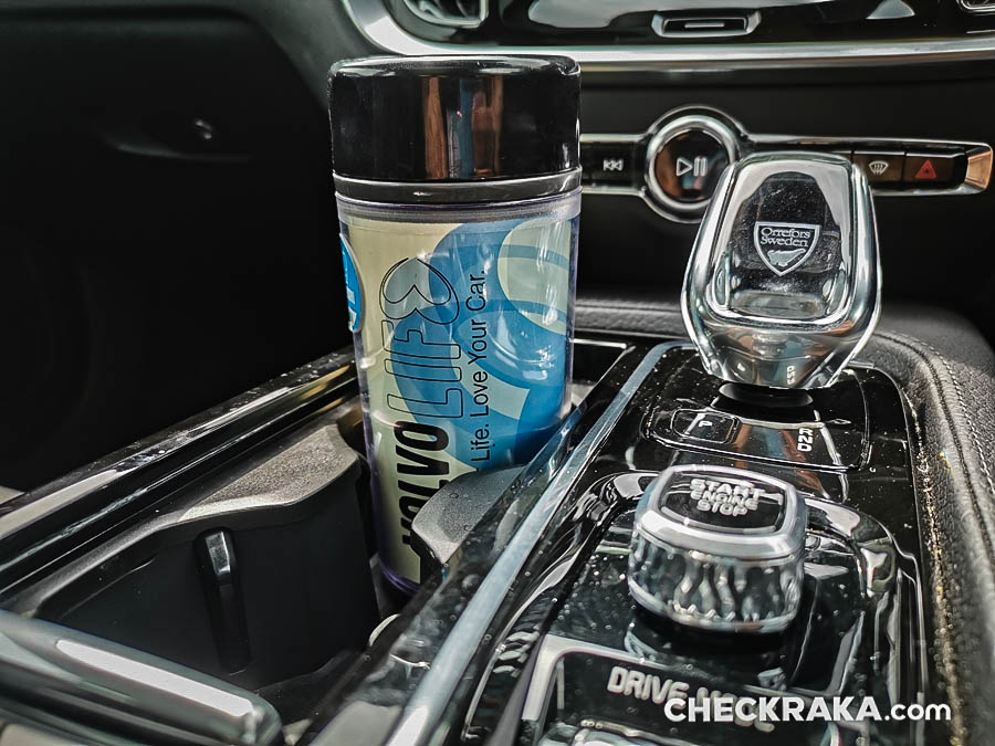 คอนโซลกลางขนาดใหญ่ไปสักหน่อยซึ่งข้างใต้ติดตั้งระบบชุดไฮบริดเอาไว้บางส่วนจึงกินที่ตรงส่วนนี้ไปพอสมควร หัวเกียร์แบบแท่งคริสตัลใสมีรูป "แมวน้ำ" จาก Orrefors Sweden ซึ่งเป็นบริษัททำเครื่องแก้วชื่อดังก่อตั้งเมื่อ 1898 ของประเทศสวีเดน ถัดลงมาเป็นสวิตช์ Start-Stop เครื่องยนต์ที่ "เซอร์ไพร์ส" โดยใช้การหมุนไปทางขวานับเป็นเอกลักษณ์เฉพาะของวอลโว่จริงๆ ถัดมาเรื่องย ๆ จะมีสวิตช์ระบบเบรกมือไฟฟ้าและ Auto Hold Brake และข้างกันเป็นช่องวางแก้วน้ำพร้อมฝาปิดเรียบร้อยสวยงาม