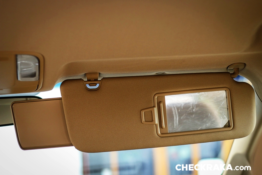 ที่บังแดดพร้อมกระจกส่องแต่ไม่มีไฟตรงจุดให้ แต่ก็พอใช้ไฟเก๋งตรงกลางอยู่ และยังสามารถดึงแผ่นกันแดดเล็ก ๆ ออกมาเพื่อปิดบังช่องระหว่างกระจกมองหลังได้อีกด้วยหรือเมื่อปรับมาใช้บังแดดด้านข้าง ส่วนตรงกลางมีชุดควบคุมไฟในรถและกระจกส่องคนนั่งหลังเอาไว้คุยแบบเห็นหน้าได้โดยไม่ต้องหันไปมองเพื่อความปลอดภัย