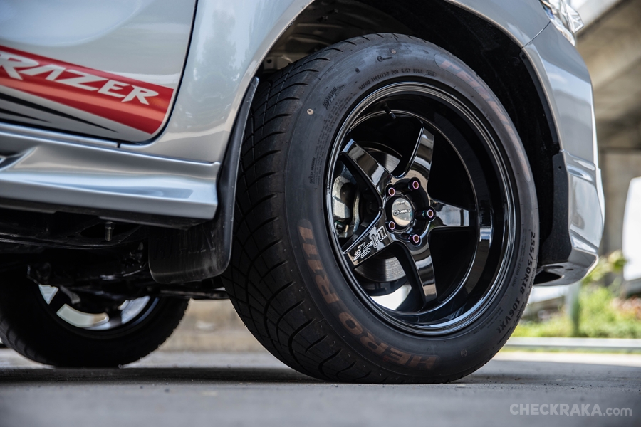 Razer ที่โตโยต้าวางเป็นออปชั่นทางเลือกเพิ่มให้ โดยคันที่นำมาได้ติดตั้งล้อแม็กจากเลนโซ่ พร้อมยางหน้ากว้าง 255/50/18 เพื่อขับความเป็นกระบะตัวซิ่งให้ชัดเจนยิ่งขึ้น เท่านั้นยังไม่พอมีการเพิ่มดีกรีความร้อนแรงให้กับขุมพลังเข้าไปอีกด้วยการใช้
