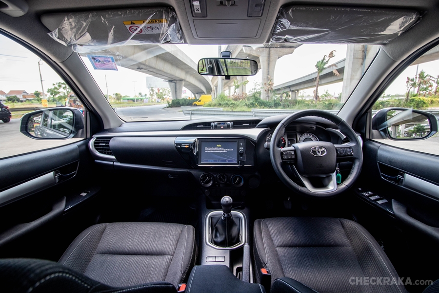 ภายในห้องโดยสารเน้นความเรียบง่าย วัสดุหุ้มเบาะเป็นผ้าสีดำคลุมโทนดำทั้งหมด เสริมความดุ คอนโซล แผงหน้าปัด เรือนไมล์ยังคงเป็นรูปแบบเดิมของ ไฮลักซ์ รีโว่ แต่รุ่นนี้นับเป็นตัวท็อปได้เรือนไมล์แบบ Optitron และมีจอแสดงข้อมูลการขับ - MID พร้อมบอกค่าต่างๆ เป็นภาษาไทย พวงมาลัยมัลติฟังก์ชันครอบคลุมการใช้งานได้ครบถ้วน โดยเฉพาะการโทรเข้าออกจากสมาร์ทโฟนที่เชื่อมต่อกับหน้าจอเฮดยูนิตขนาด 8 นิ้ว พร้อมให้การสัมผัสที่ดีจากวัสดุหนังที่หุ้มเดินด้ายเย็บปราณีตไม่ได้ถูกลดทอนลงแต่อย่างใด เช่นเดียวกับหัวเกียร์ก็หุ้มหนังเช่นกัน ช่องเก็บของด้านซ้ายบนยังเป็น COOL BOX ไว้ใช้เก็บของที่ต้องการรักษาความเย็น และสะดวกโดนใจกับที่วางแก้วหรือกระบอกน้ำใต้ช่องแอร์ซ้ายขวา โดยรวมนับว่าครบถ้วนที่เพิ่มเติมทันสมัยก็คือ การเชื่อมต่อของระบบแอนดรอยด์ ออโต้ กับแอบเปิ้ล คาร์เพลย์ ทำให้ใช้งานแอปพลิเคชั่นจำเป็นจากสมาร์ทโฟนผ่านจอได้เลย เช่น กูเกิ้ลแมพ ซึ่งเป็นแอปฯ จำเป็นต่อการเดินทาง อย่างไรก็ตามที่ขาดหายไปอย่างน่าเสียดายคือ กล้องมองหลังเวลาถอย หรืออย่างน้อยก็น่ามีเซนเซอร์ถอยให้มา แต่ก็สามารถติดเพิ่มเติมภายหลังได้ไม่ยาก สุดท้าย T connect เหมือนไฮไลท์เด็ดที่กลบเรื่องกล้องหลังที่ขาดหายไป