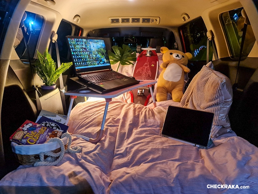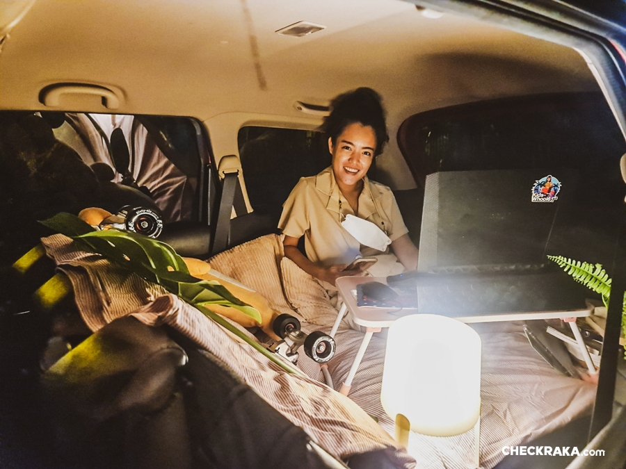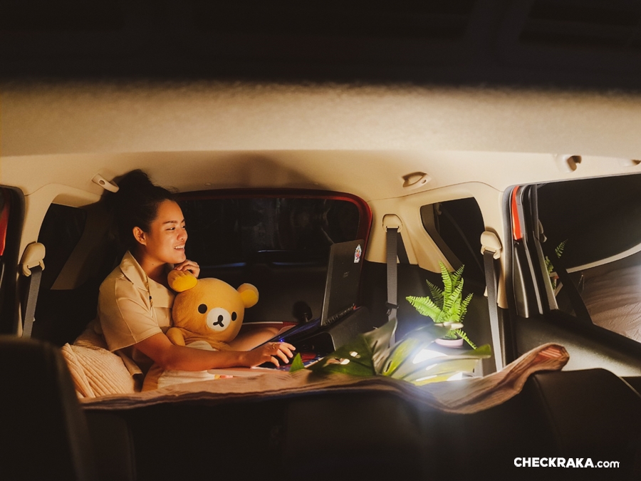 ผู้เขียนเลยอยากลองจักแจงเปลี่ยนบรรยากาศจัดที่นอน หมอนมุ้ง ตกแต่งให้ท้ายได้ฟิลลิ่งใหม่ เหมือนออกไปปิคนิค พร้อมด้านหลังมีช่องชาร์จไฟ 12v ที่ให้เราเสียบสายต่อกับอุปกรณ์ที่สามารถเสียบหัวเข้ากับตัวชาร์จในรถได้ อำนวยความสะดวกให้คุณได้เสียบโคมไฟ เหมือนอยู่ในห้องเล็กๆ แต่อบอวนด้วยความสบายและกลิ่นอายแคมป์ปิ้ง เนรมิตท้ายรถเจ๋งๆ เป็นที่นอนสุดคูลก็ไม่เลว ที่สำคัญเมื่อเป็นรถที่พับเบาะได้ ก็สามารถที่จะปรับ ยัด ขน ย้าย เท่าที่รถจะรับน้ำหนักไหว