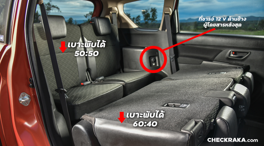 เข้ามาภายในที่ผู้เขียนอยากขายของจริงๆ เพราะนี่คงเป็นโอกาสให้เราได้ออกแบบท้ายรถเป็นห้องนอน ห้องทำงาน หรือแบบแคมปิ้งน่ารักๆ สายเที่ยวเดี่ยวๆ ในโหมด Stand Alone คงชอบเพราะมันได้ความเป็นส่วนตัวเพราะ "คุณลูกค้าขา คุณลูกค้าขา" เบาะหลังสุดเขาพับลงได้ 50:50 ค่ะ และเบาะที่นั่งตรงกลางอีก 60:40 ซึ่งเบาะกลางสามารถขยับเลื่อนขึ้นไปข้างหน้า แถมรถยังออกแบบมาให้รู้ใจ ในส่วนที่นั่งท้ายสุดทั้ง 2 ข้างจะมีที่วางแก้วน้ำตรงที่วางแขนพอพับเบาะแบบปรับนอนมันก็สามารถวางแก้วน้ำ วางไอแพด ได้สบายๆ แถมที่นั่งตอนหลังด้านบนเขามีพัดลมระบายอากาศที่สามารถปรับความแรงลมได้ถึง 4 ระดับ แต่อาจต้องสตาร์ทรถไว้เพื่อใช้ไฟนะจ๊ะ หรือถ้าใครมีอุปกรณ์ที่เพาเวอร์แบ้งค์ของคุณมีกำลังวัตต์สูงๆ ก็พกมาใช้เสียบสายไฟเพิ่มอรรถรสให้บรรยากาศห้องนอนท้ายรถของคุณได้แบบฟินๆ