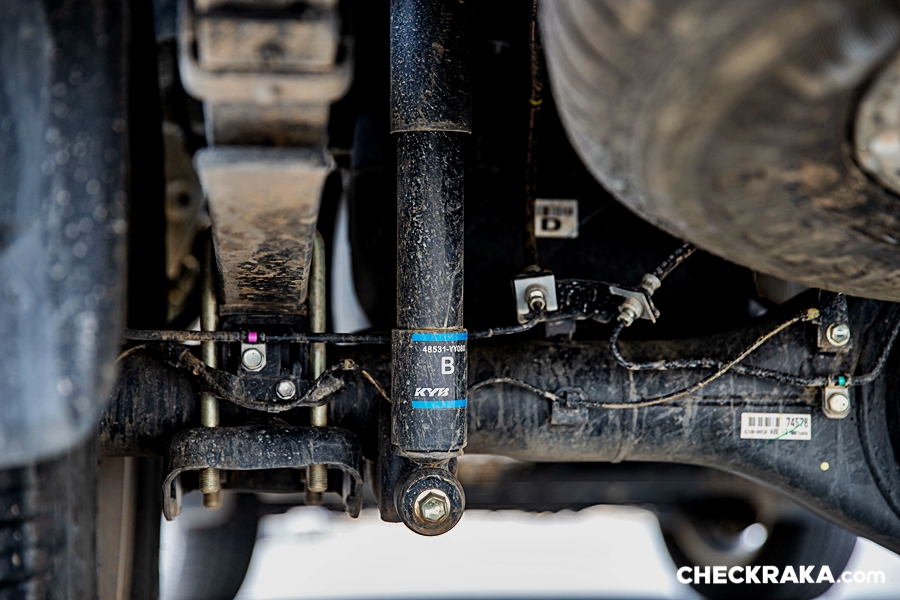 ระบบช่วงล่างต้องยอมรับว่า "หนึบและแน่น" ขึ้นกว่าเดิม โดยเฉพาะช่วงเข้าโค้ง เปลี่ยนช่องทางอย่างกระทันหัน มีอาการโยนหรือเหวี่ยนน้อยลงกว่ารุ่นที่เคยทดสอบ (Revo Rocco 2.8) เมื่อช่วงล่างกระชับส่งผลให้การควบคุมพวงมาลัยแม่นยำขึ้นอีกนิด แต่ก็ต้องแลกกับความกระด้างขึ้นเช่นกัน เมื่อช่วงล่างที่แข็งและหนืดขึ้น ในการขับขี่ความเร็วต่ำ ๆ ผ่านถนนคอนกรีตมีอาการดีดและเด้งอย่างชัดเจน ถ้าเป็นผู้ขับอาจรู้สึกถึงความดิบ ๆ สนุกและได้อารมณ์รถแข่ง แต่ถ้าเป็นผู้โดยสารอาจจะมีอาการจุกบ้างเวลาตกหลุดมหรือกระโดดคอสะพาน