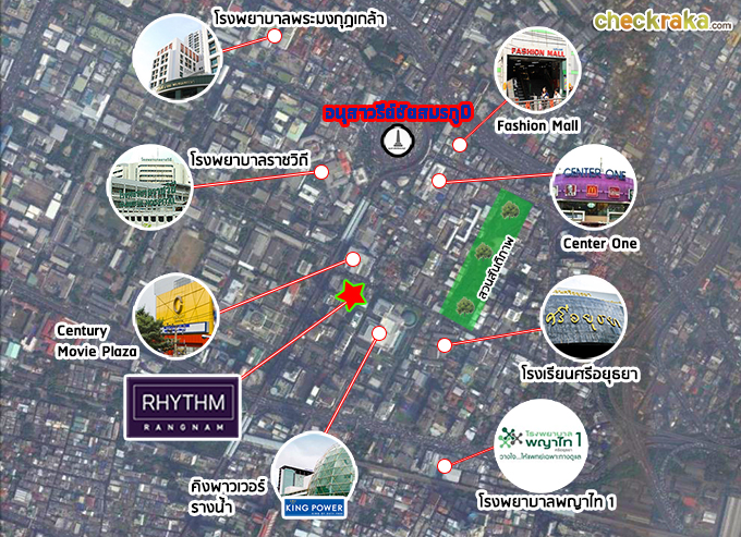 แผนผัง Area Map พื้นที่รอบๆ BTS สถานีอนุสาวรีย์ชัยสมรภูมิคลิกดูแผนที่ใหญ่ : http://www.bts.co.th/customer/th/images/area-map/N3_update.gif การเดินทางโดยใช้รถไฟฟ้า BTS น่าจะเป็นเส้นทางที่สะดวกที่สุดสำหรับชีวิตคนเมืองในยุคนี้ จาก "Rhythm รางน้ำ" ไป Siam Paragon หรือ EmQuartier แค่ก้าวเท้าขึ้นรถไฟฟ้าถัดไปไม่กี่สถานีก็เดินช้อปปิ้งห้างหรูได้แล้ว อีกทั้งยังเชื่อมต่อไป Airport Link สถานีพญาไท แค่ 1 สถานีเท่านั้น ซึ่งตอบโจทย์สำหรับคนทำงานสนามบินสุวรรณภูมิหรือชาวต่างชาติ นักธุรกิจที่ต้องเดินทางไป-กลับสนามบินเป็นประจำได้เป็นอย่างดีเลย หรือจะซื้อไว้ลงทุนในอนาคตก็น่าสนใจไม่น้อยค่ะ