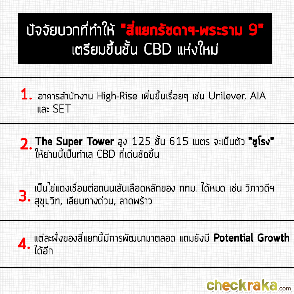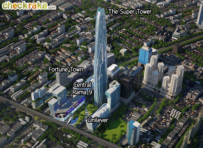 บริเวณแยกพระราม 9 ฝั่งที่ดูจะคึกคักและเป็นที่จับตามองที่สุด ก็คือ "ฝั่งเซ็นทรัลพระราม 9" ค่ะ เพราะเป็นทำเลที่กำลังจะกลายเป็นใจกลางย่านธุรกิจ ซึ่งตอนนี้กำลังมีการก่อสร้างอาคาร รวมถึง Landmark แห่งใหม่ของเมืองไทยอย่าง "The Super Tower" ในอดีตฝั่งนี้เป็นพื้นที่ว่างเปล่า หรือไม่ได้ใช้ประโยชน์ในเชิงพาณิชย์อย่างเต็มที่ แต่หลังจากเริ่มมี Central พระราม 9 ย่านนี้ก็เริ่ม "จุดติด" และปัจจุบันแผนการพัฒนาตรงนี้ก็เป็นรูปเป็นร่างขึ้นมาเรื่อยๆ แล้ว
