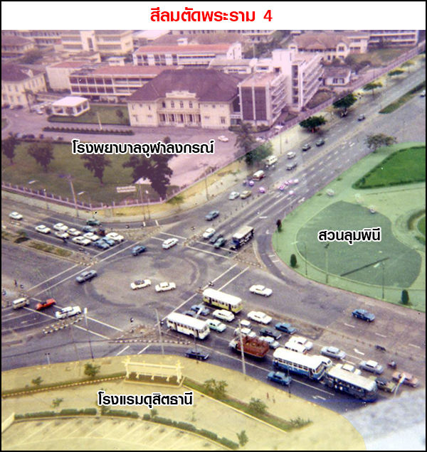 ภาพบริเวณแยกศาลาแดงไม่ทราบปี แต่ยังไม่มีการสร้างสะพานข้ามแยกและรถไฟฟ้า BTS