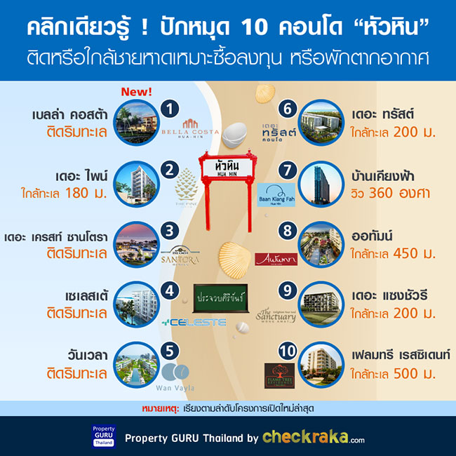 บ้านพักตากอากาศริมทะเล จะมีใครบ้างไม่อยากเป็นเจ้าของ และถ้าเลือกทำเลได้ 80% ก็คงอยากอยู่ติดหาดหัวหิน เนื่องจาก "หัวหิน" ไม่ไกลจากกรุงเทพฯ แถมยังมีชายหาดที่สวย สะอาด และมีมนต์เสน่ห์ในเชิงท่องเที่ยวที่มีความหลากหลายทั้งธรรมชาติ และวัฒนธรรมสมกับที่ Trip Advisor ได้มีการรวบรวม "10 Things to do in Hua Hin" ไว้เลย และเราก็ได้ทำเป็น Infographic ไว้ท้ายบทความนี้ให้ด้วยค่ะ แต่ก่อนอื่น เราจะพาไปดูคอนโด 10 โครงการที่อยู่ติดทะเลแบบสุดๆ หรือไม่ไกลจากชายหาดที่น่าสนใจสำหรับไว้พักตากอากาศ หรือซื้อลงทุนกันค่ะ โดยจะเริ่มจากโครงการใหม่ล่าสุดในหัวหินอย่าง "Bella Costa Hua-Hin" จากค่าย Property Perfect เราไปดูกันเลยค่ะ